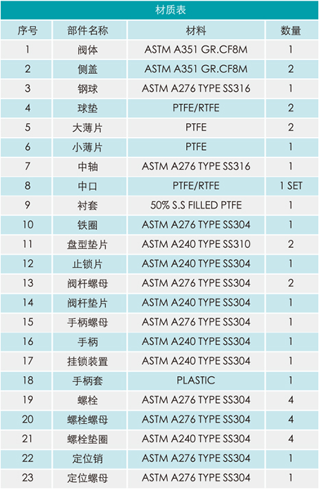 結(jié)構(gòu): 閥桿防爆出裝置設(shè)計 閥體設(shè)計合理便于快速拆裝 頂端平臺連接符合ISO5211標(biāo)準(zhǔn) 容易實現(xiàn)自動化控制和遠(yuǎn)距離控制 通道平整光滑,不易沉積介質(zhì),易于清洗 優(yōu)點: 流體阻力小 密封性能好 閥桿密封可靠 開關(guān)迅速,方便 全面符合最新國際規(guī)范 技術(shù)參數(shù): 閥類: 金屬球閥 閥體材質(zhì): 1.4408,CF3M 工作壓力: 0-63 bar 最高工作溫度℃: 180 ° C 通徑范圍DN : 8-100