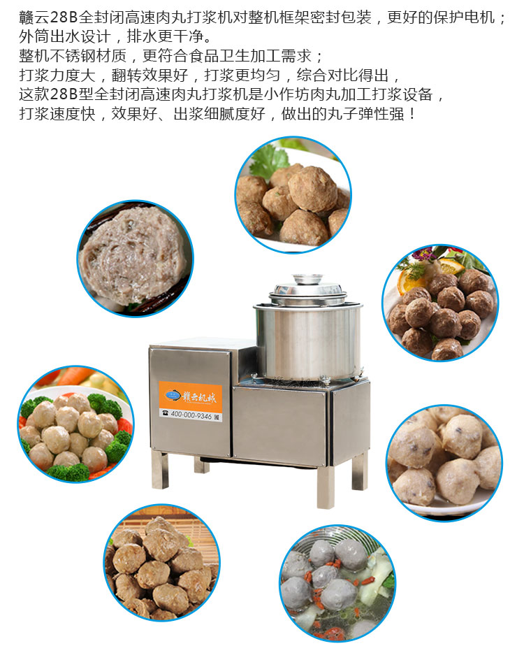 贛云牌28型新款全封閉傳動式肉丸打漿機(jī),高速肉丸機(jī)采用優(yōu)質(zhì)不銹鋼板材加工精制而成,符合食品衛(wèi)生加工需求,打漿刀型角度大,翻轉(zhuǎn)效果好,大皮帶輪帶小皮帶輪傳動適當(dāng)增加打漿速度,配用4.0kw二極高速純銅線電機(jī),整個機(jī)器底部被不銹鋼板材封裝,使用更安全!