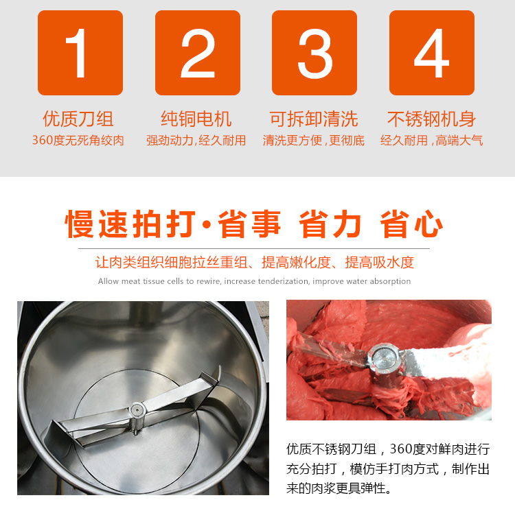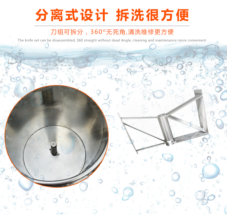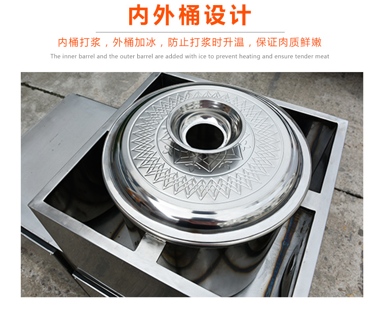 贛云牌36型全封閉式慢速肉丸打漿機選優質不銹鋼,在全不銹鋼慢速肉丸打漿機基礎上將整機外殼用不銹鋼板材封裝,更好的保護電動機,通過小皮帶輪帶動大皮帶輪減速,慢速拍打肉漿。
