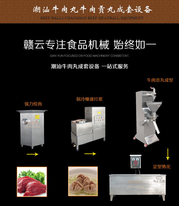 潮汕牛肉丸成套設備,本套設備專為潮汕牛肉丸加工定制,采用強力碎肉、慢速拍打、貢丸成型、自動熟化和真空包裝設備組合而成,適合潮汕人加工正宗潮汕牛肉丸用,改傳統(tǒng)工藝為機械化生產潮汕牛肉丸,1-2人只需1個小時即可完成日常加工一天工作量或十多人的產量。時產50kg潮汕牛肉丸。