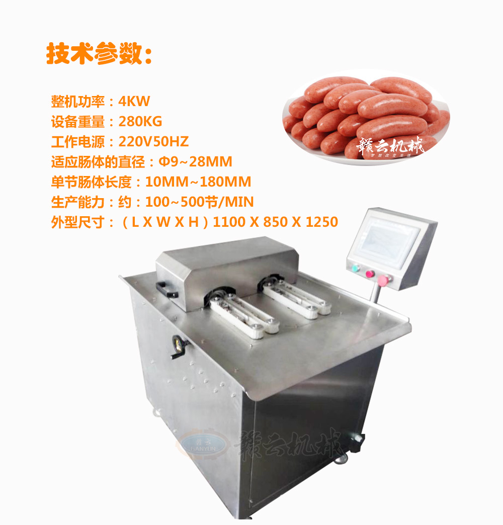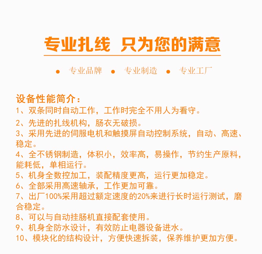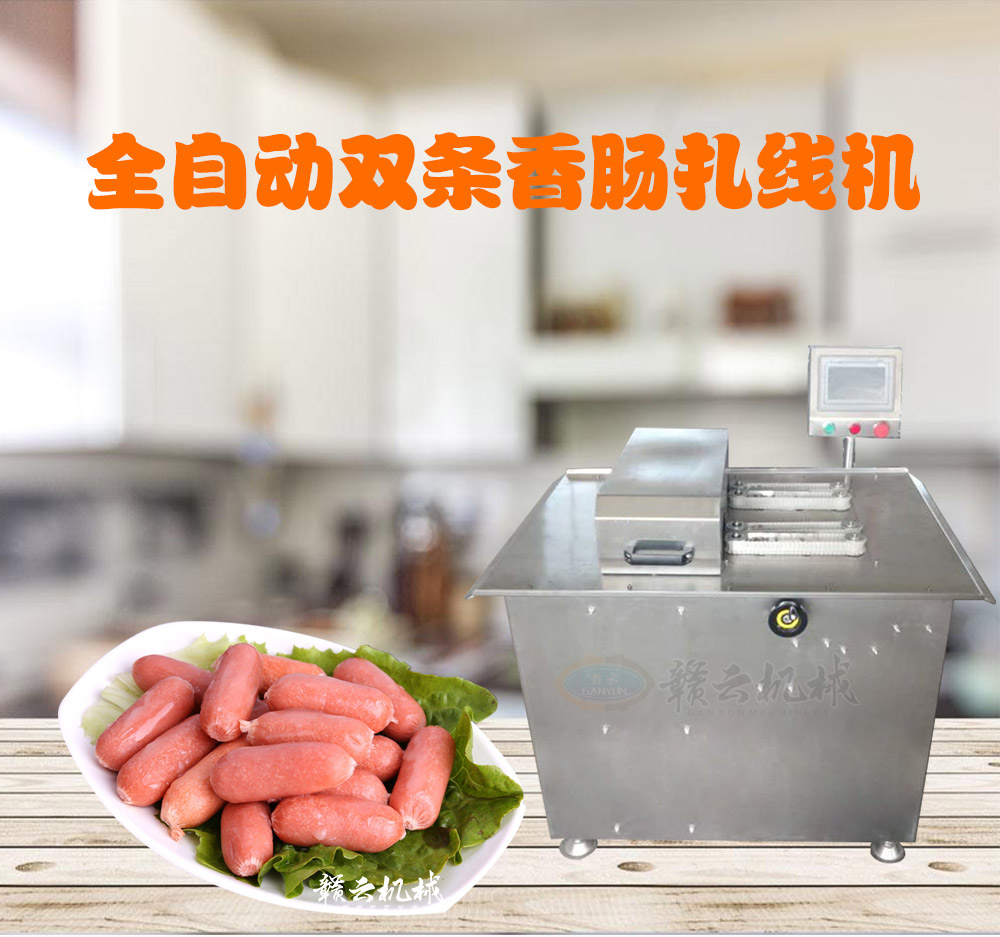 全自動雙路高速香腸扎線機,自動分份,自動繞線,全程自動化控制。該機采用了優質電機和本公司自主研發的控制系統,機身全不銹鋼制造、效率高、易操控、節約生產原料等優點,產品長度的調節可以隨心所欲