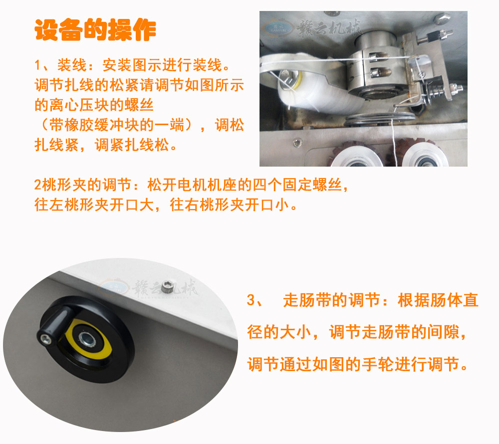 該香腸扎線機機械的優點是節約腸衣,并且線扎的產品不用人工和機械剪節,相對扭結可節約人工3人以上和對剪節設備的投入;相對半自動扎線機可節約10人的費用,切免除工人的體力勞動之苦。該扎線機操控十分簡單,由于采用人機對話的液晶屏,設定長度和速度后,便可以讓機械自動高效完成所有工作。