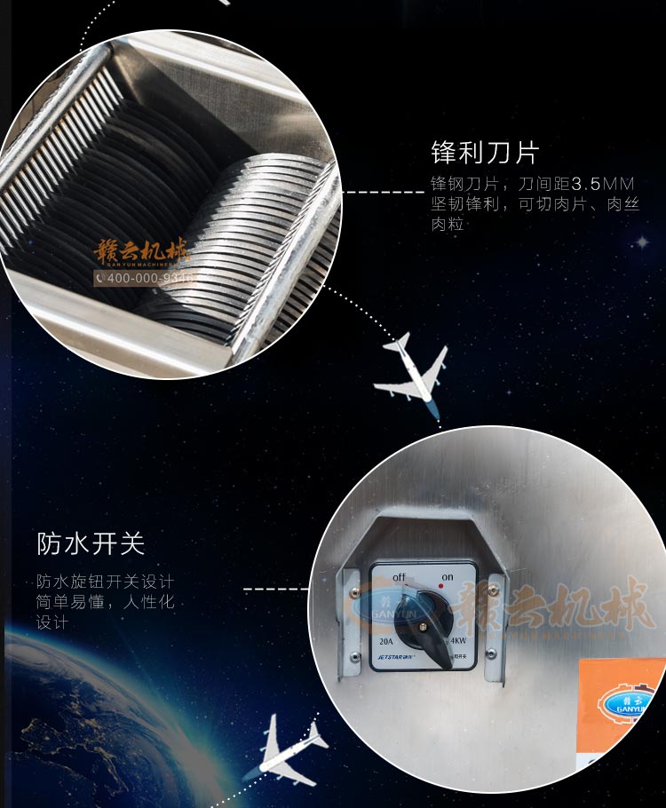 不銹鋼切肉機不銹鋼切肉機,進料口鏤空設計,方便看到下料進度,進料口防護蓋板材加厚,堅固耐用。鋒利刀片,刀間距3.5mm,切切肉片、肉絲、肉粒。防水旋鈕開關。折疊出料口,節省空間,推回可防止料斗刮壞。側板拆卸可看到電機。304不銹鋼機身,兩個萬向輪,兩個非萬向輪,容易固定,省心。