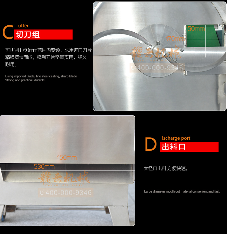 中央廚房凈菜加工設備之一_贛云牌150型數字切菜機,引進先進技術,利用斬刀快速切割原理設計,適合各類葉菜類,球根類的切割工序,1-60mm范圍內變頻可調,適合多元化中央廚房參與食堂切配之用,贛云機械,掌握肉丸加工成套設備,中央廚房凈菜設備核心技術,咨詢電話400-000-9346