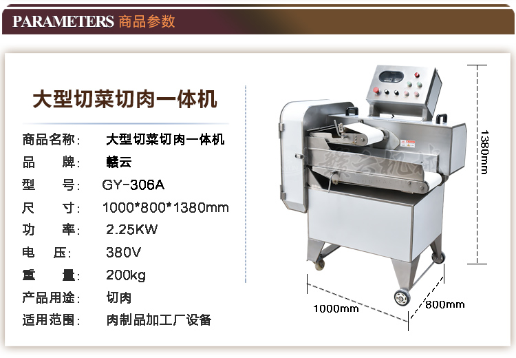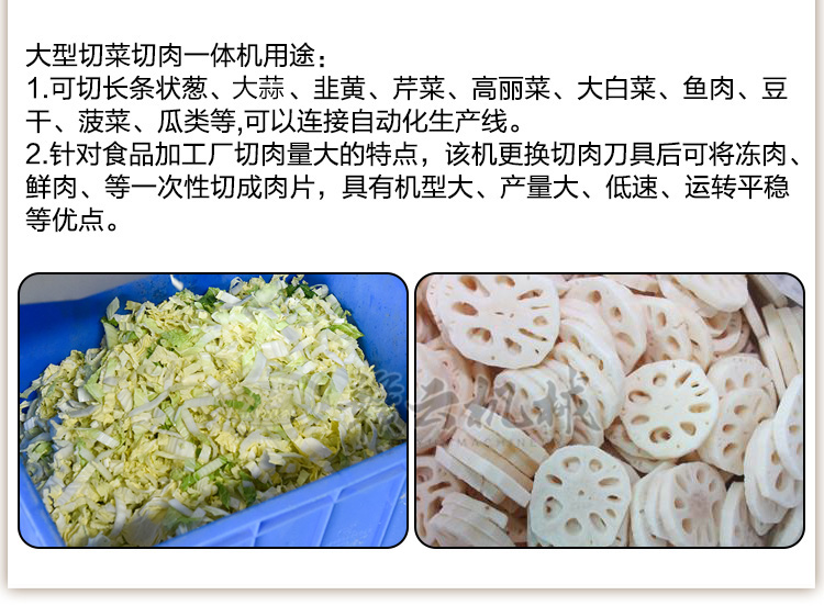 大型切菜切肉一體機用途可切長條狀蔥、大蒜、韭黃、芹菜、高麗菜、大白菜、魚肉、豆干、菠菜、瓜類等、可以連接自動化生產線。針對食品加工廠切肉量大的特點,該機更換切肉刀具后可將凍肉、鮮肉、等一次性切成肉片,具有機型大、產量大、低速