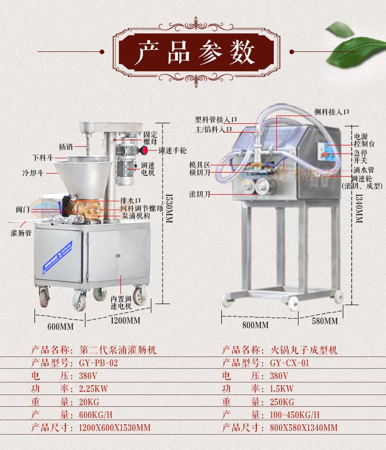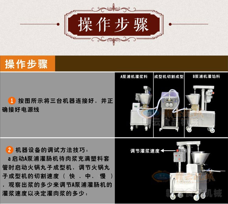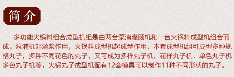 多功能火鍋料組合成型機(jī)組是由兩臺(tái)泵浦機(jī)和一臺(tái)火鍋料成型機(jī)組合而成,泵浦機(jī)起灌漿作用,火鍋料成型機(jī)起成型作用,本套成型機(jī)組可成型多種規(guī)格丸子,多種不同花色的丸子,又可稱為多樣丸子機(jī),花樣丸子機(jī),單色丸子機(jī),多色丸子機(jī)等等。