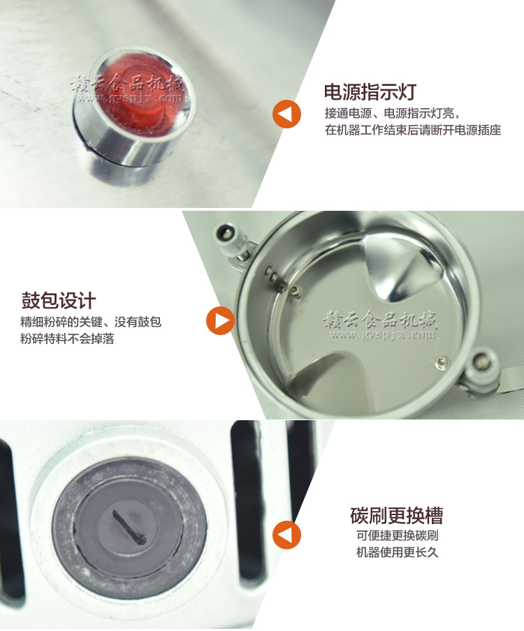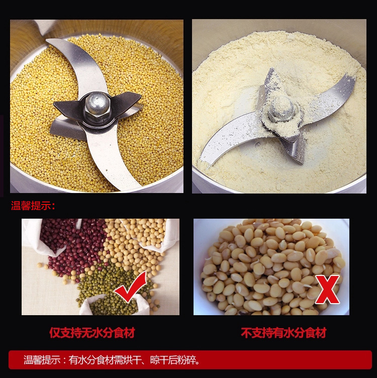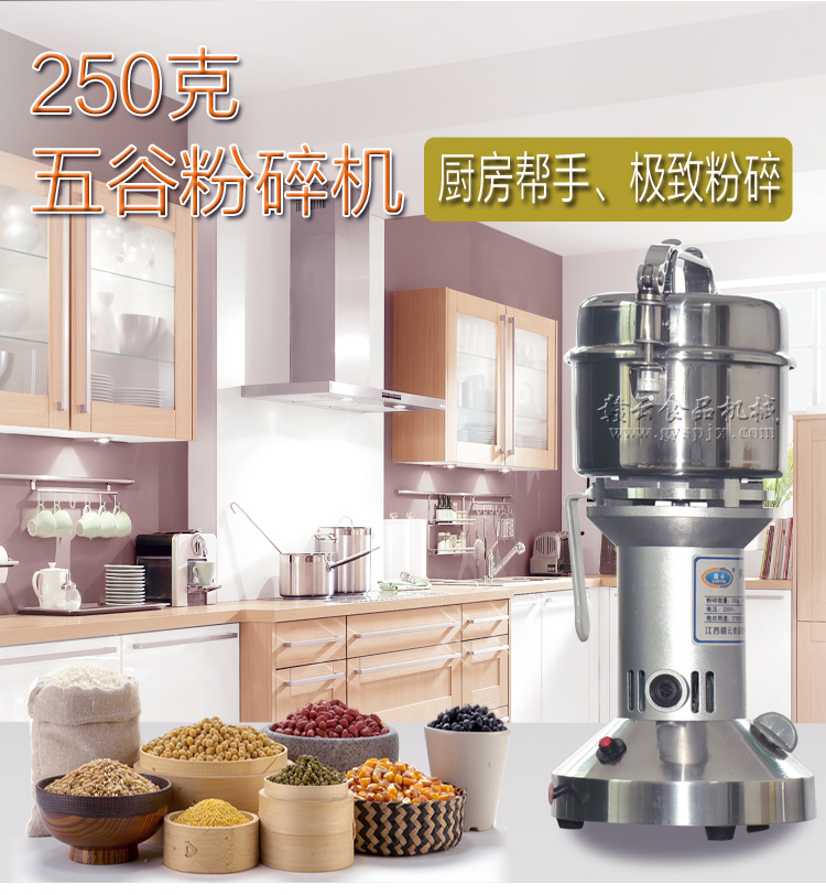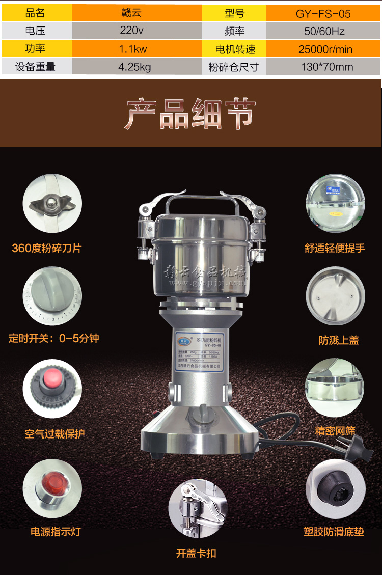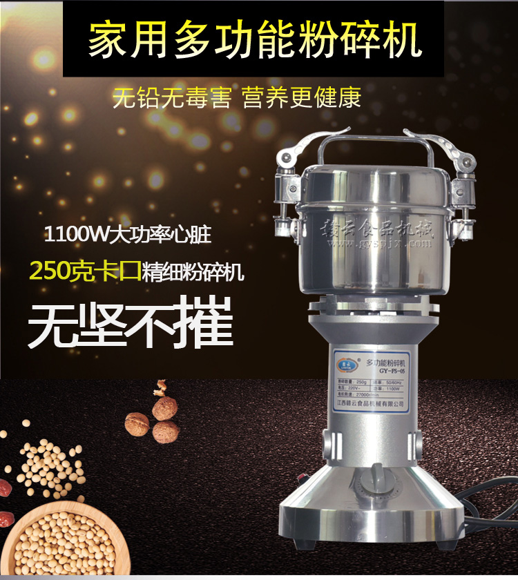 贛云系列多功能粉碎機采用純銅高速電機帶動粉碎刀片將物料快速打成粉末,可用于粉碎五谷、雜糧、田七、阿膠、白叁等,一般粉碎時間1-2分鐘即可,新款粉碎機改保險絲為空氣過載保護器,使用更安全,我廠提供的粉碎機有100克-1000克不同型號的多功能粉碎機。