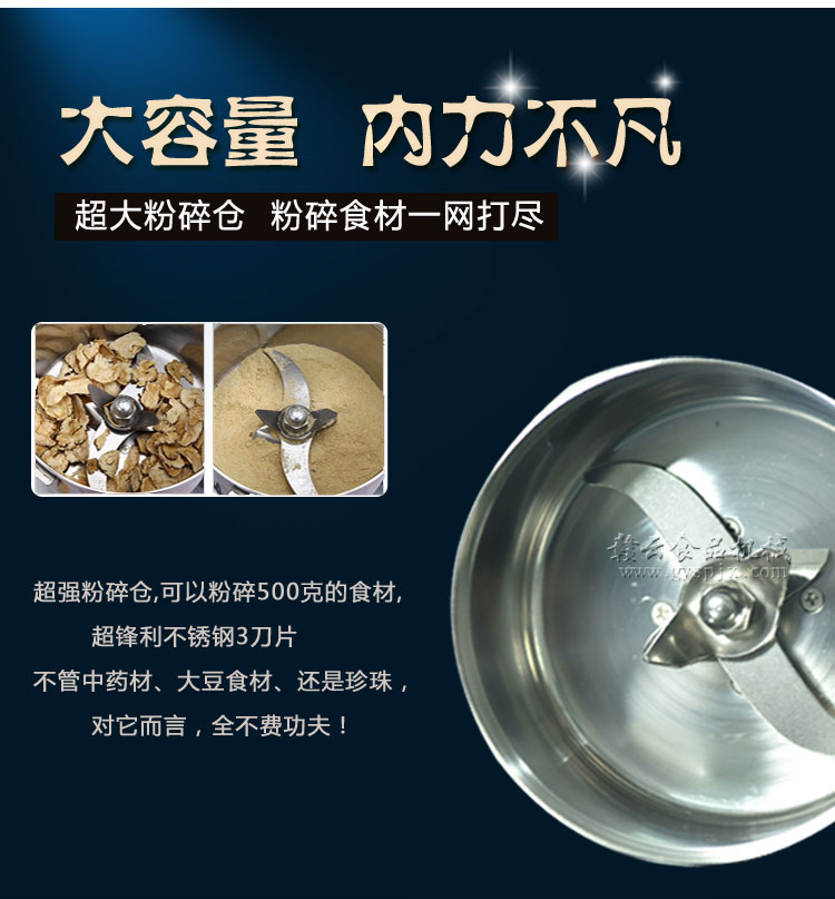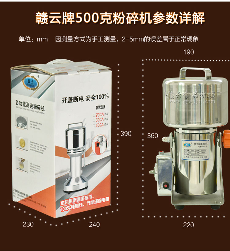 贛云系列多功能粉碎機(jī)采用純銅高速電機(jī)帶動(dòng)粉碎刀片將物料快速打成粉末,可用于粉碎五谷、雜糧、田七、阿膠、白叁等,一般粉碎時(shí)間1-2分鐘即可,新款粉碎機(jī)改保險(xiǎn)絲為空氣過(guò)載保護(hù)器,使用更安全,我廠提供的粉碎機(jī)有100克-1000克不同型號(hào)的多功能粉碎機(jī)。