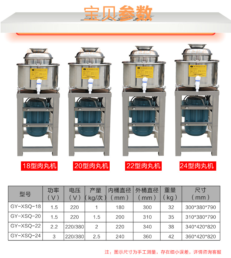 贛云牌新款全不銹鋼肉丸機,22型肉丸機采用全不銹鋼材質,在舊款全不銹鋼肉丸機的基礎上給支撐架加粗加厚,用不銹鋼蓋,打漿雙桶,刀柄刀片均采用不銹鋼材質。打漿桶裝肉量2l,一次可打肉漿4斤左右,采用2800r/min高速電機,故稱之為高速肉丸機。