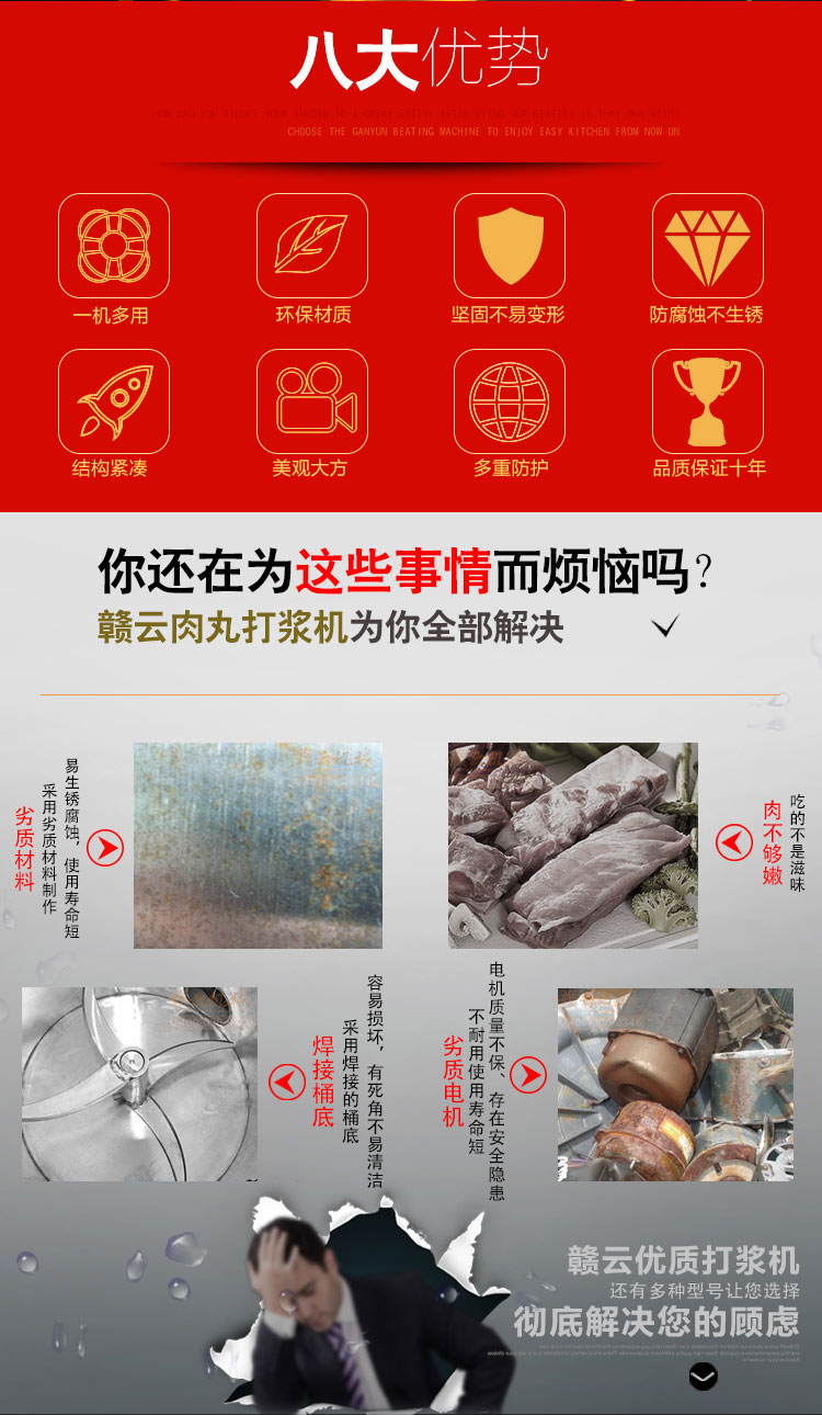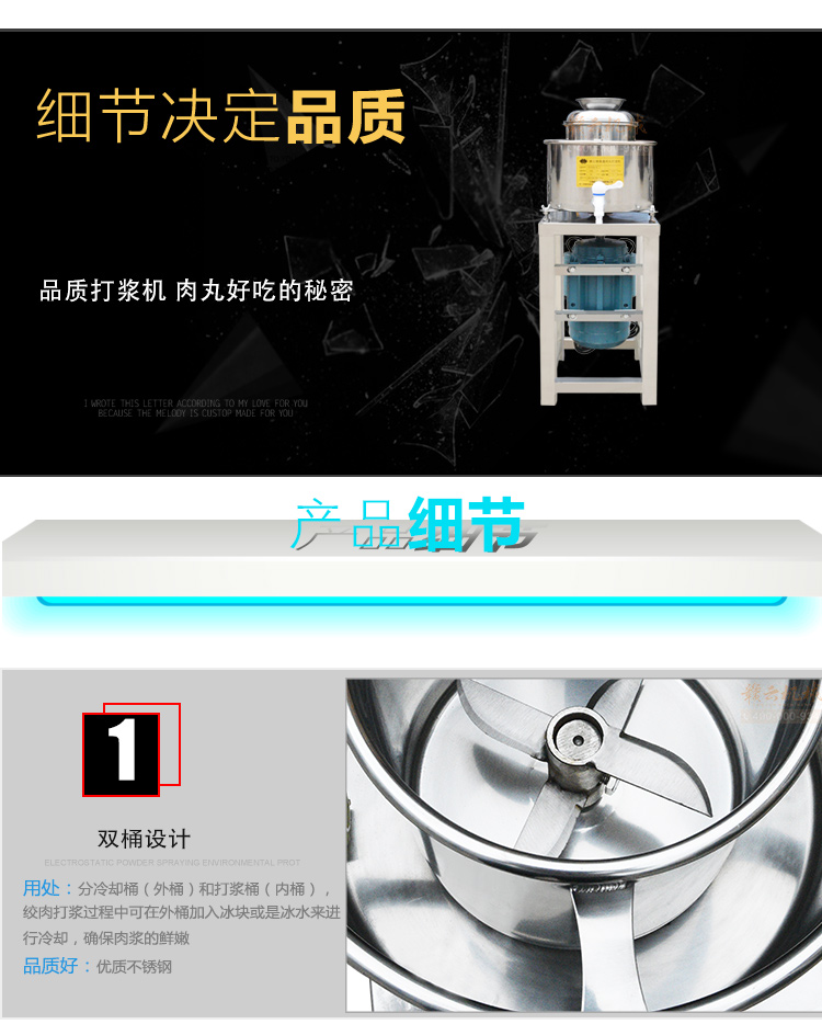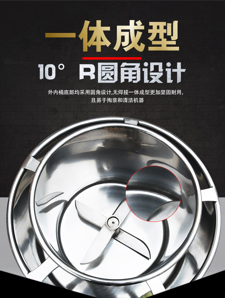 贛云牌肉丸打漿機(jī)采用全不銹鋼材質(zhì),默認(rèn)配用1.5kw國標(biāo)銅線贛云牌電動機(jī),打漿刀片和刀架、攪拌圈、蓋子、支持架、打漿雙桶、軸承、螺絲均采用不銹鋼材質(zhì),是正真意義上全不銹鋼