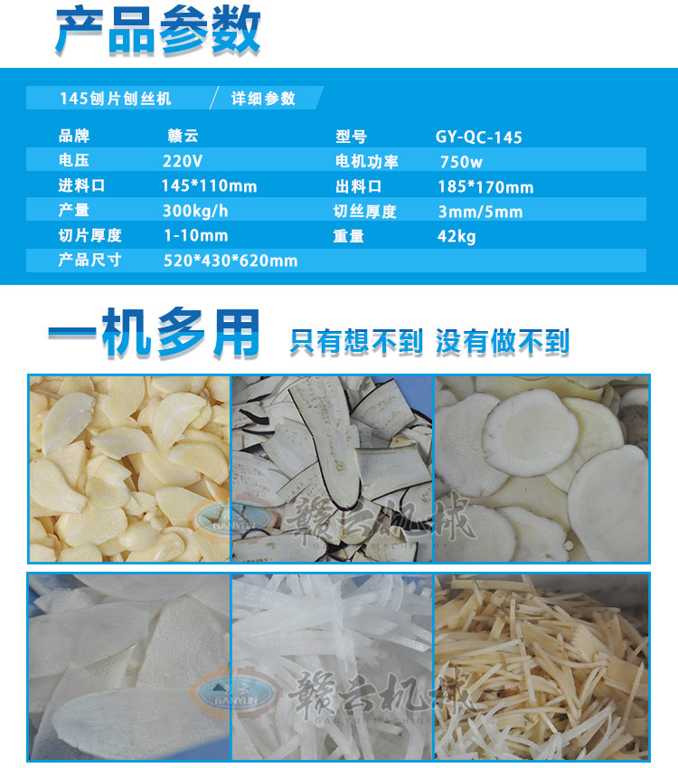 贛云牌145型刨片刨絲機,可用于土豆、蘿卜、胡蘿卜、茄子、黃瓜等刨片或刨絲,還能切顆粒,整機外殼采用不銹鋼材質,小巧精致,刨片厚度可調范圍1-10mm,配有固定切絲刀3mm和5mm規格。特別適用于學校食堂,果蔬加工廠,礦場、部隊等大型食堂加工之用。