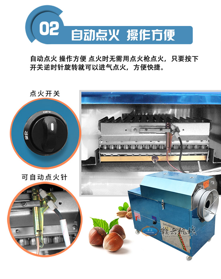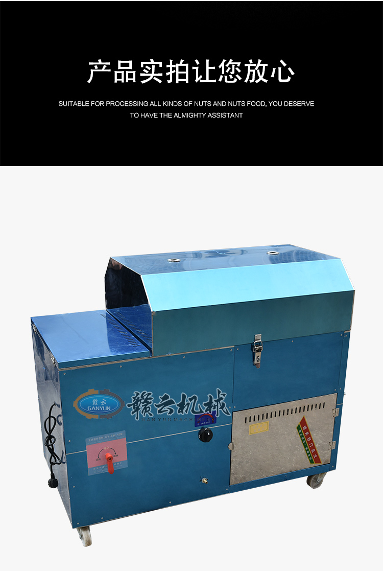 炒貨出入鍋十分方便,只需按動正反轉開關,電機既帶動滾筒反轉,炒貨和小石子會一同出鍋,自動分離,迅速快捷,省事不費力,干凈又衛生。是一種值得廣大中小投資者關注的好設備,適合于炒貨廠、商場、菜市場、超市居民區農村集市等固定經營,也可流動現炒。