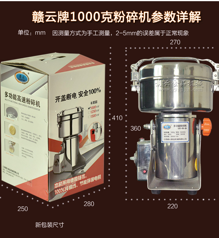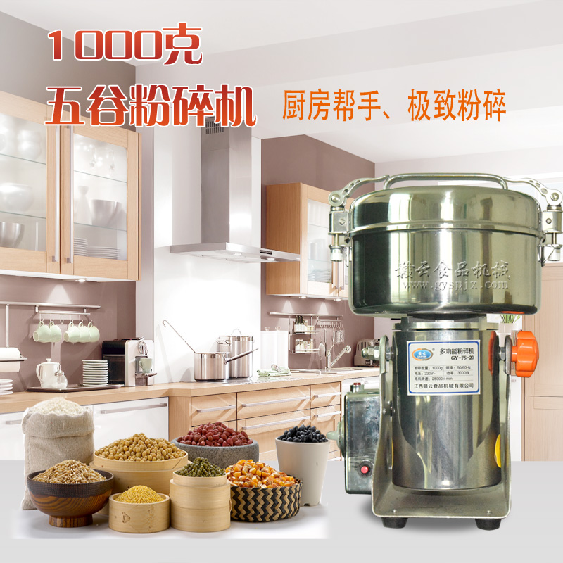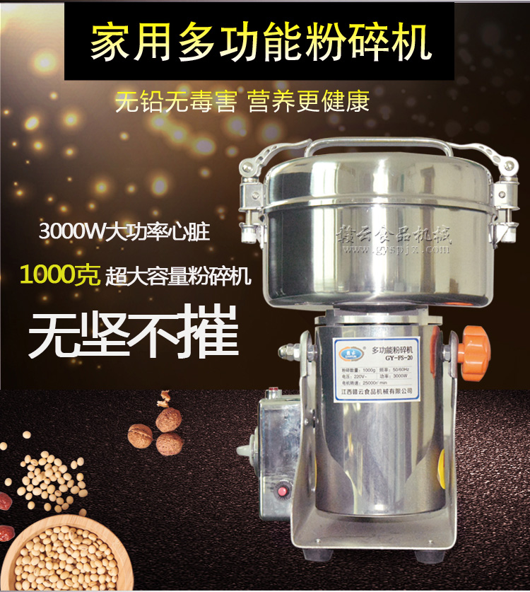 贛云系列中藥五谷粉碎機又稱打粉機,采用超高速純銅電動機帶動粉碎刀快速將物料打成粉碎狀,固又稱之為高速粉碎機,打粉機,我廠生產的多功能粉碎機可容納100克-2500克不等產品。這是一款1000克快速開蓋式粉碎機。