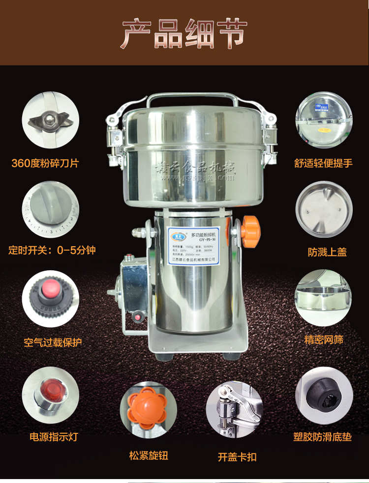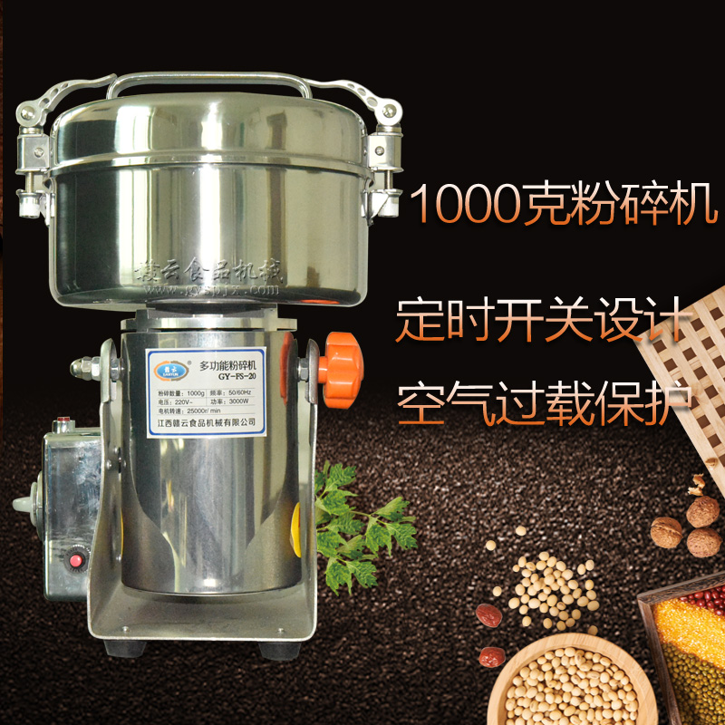 贛云系列多功能粉碎機采用純銅高速電機帶動粉碎刀片將物料快速打成粉末,可用于粉碎五谷、雜糧、田七、阿膠、白叁等,一般粉碎時間1-2分鐘即可,新款粉碎機改保險絲為空氣過載保護器,使用更安全,我廠提供的粉碎機有100克-2500克不同型號的多功能粉碎機。