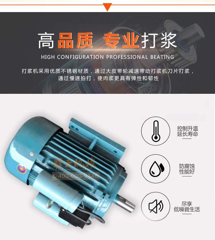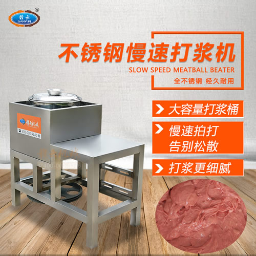 贛云牌全不銹鋼慢速魚丸、肉丸打漿機采用優質不銹鋼材質,通過大皮帶輪減速帶動打漿機刀片打漿,通過慢速拍打,使肉漿更具有彈性和韌性。適合魚丸、牛肉丸和貢丸的制漿之用。