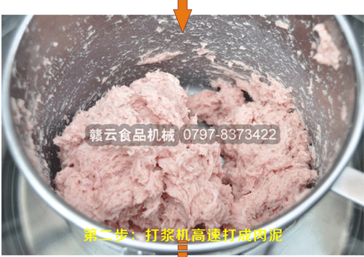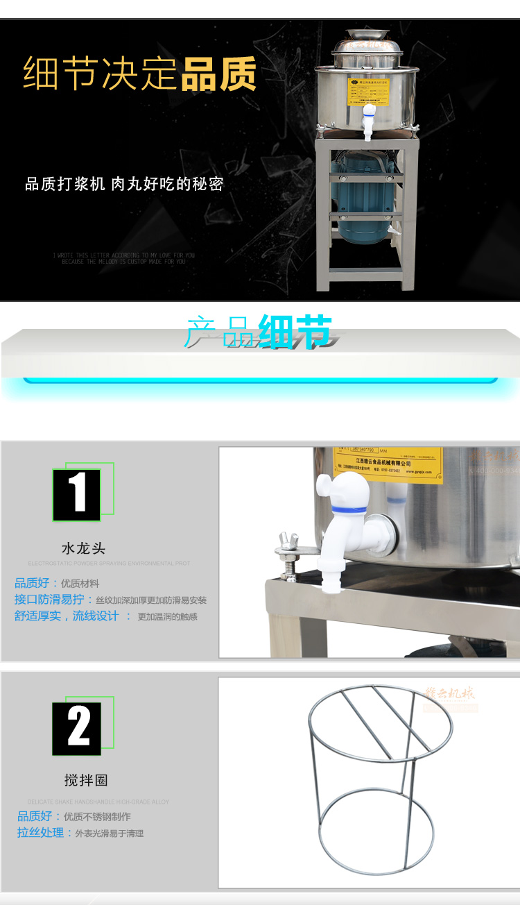 贛云牌新款全不銹鋼肉丸機,22型肉丸機采用全不銹鋼材質,在舊款全不銹鋼肉丸機的基礎上給支撐架加粗加厚,用不銹鋼蓋,打漿雙桶,刀柄刀片均采用不銹鋼材質。打漿桶裝肉量2L,一次可打肉漿4斤左右,采用2800r/min高速電機,故稱之為高速肉丸機。