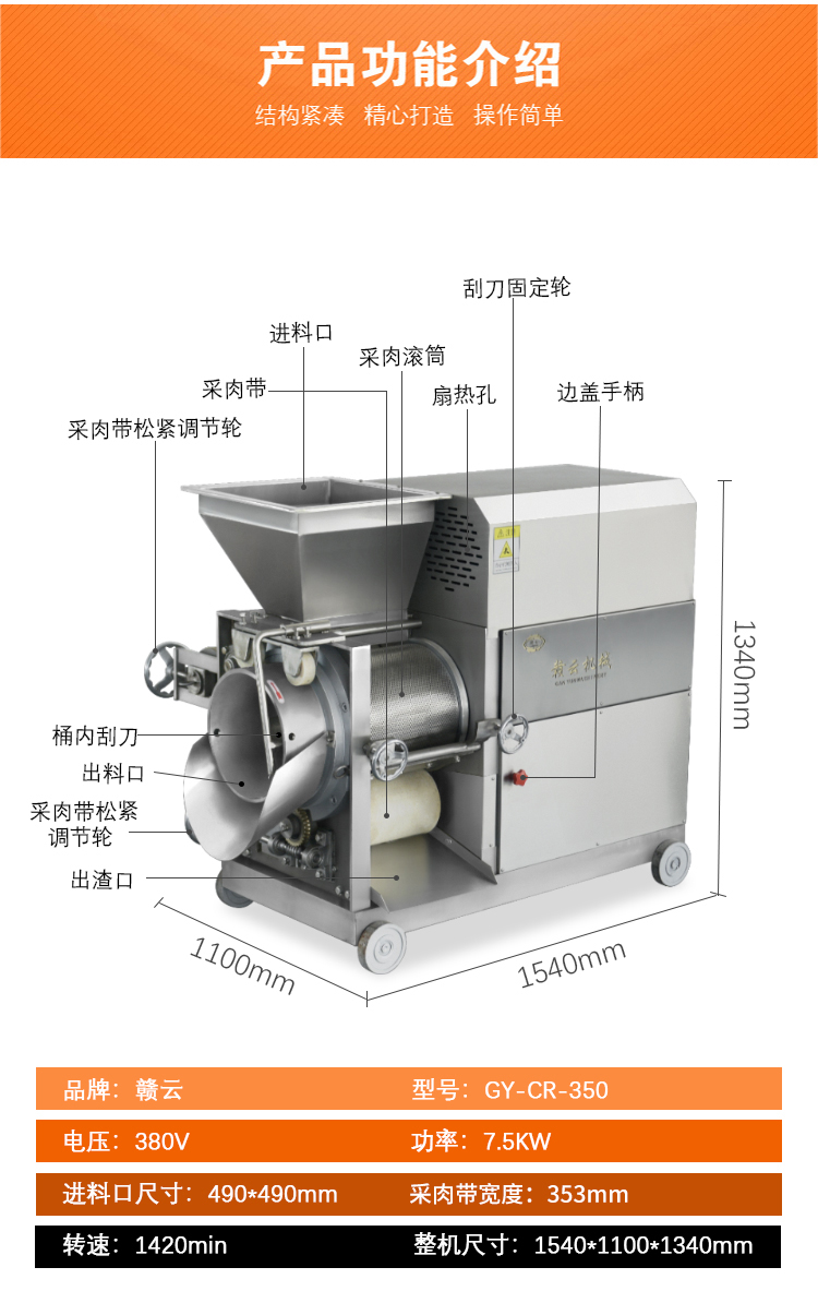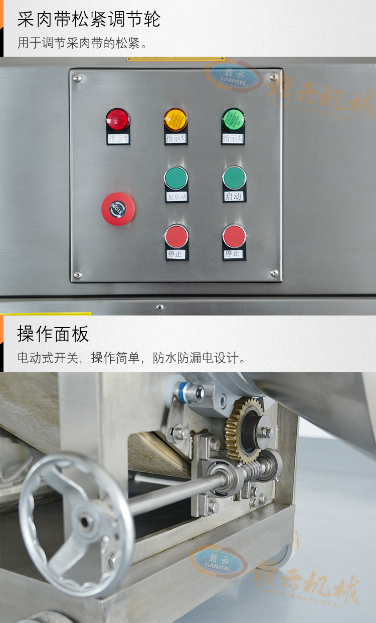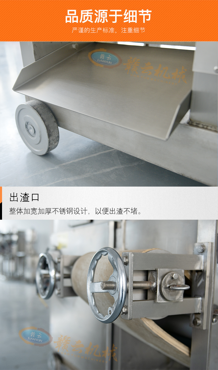 贛云牌350型魚肉采肉機采用全304不銹鋼,整體結構設計高端大氣,牢固耐用,性能穩定,各種調節裝置設計合理,人性化操作程度高,增加了潤滑軸承的功能。以下是這款機器的結構示意圖和實物拍攝細節圖等。