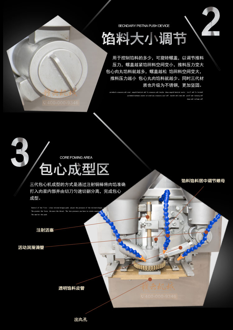第三代包心肉丸機是在贛云二代包心肉丸機的基礎上,對二代包心機的成型切割部位進行優化提速處理,達到每分鐘200粒的成型速度是二代包心機的兩倍,且推料控制方式還是選用一級絞龍推料和二次泵定量輸送相結合的原理,餡料控制改塑料螺蓋為不銹鋼抗氧化特殊處理螺蓋,餡斗新增絞龍擋板,可有效防止肉餡余留餡斗,更易肉餡的向下擠壓輸送作用,成型旋轉齒輪上新增潤滑滴管,彌補了二代包心機成型區域局部潤滑切刀的缺陷,做出的包心包餡丸表皮光滑,個體圓且大,成型速度快,無小尾巴等優勢。綜上優勢pk二代和目前其他廠家新款式包心肉丸機,故稱之為贛云第三代包心肉丸機!