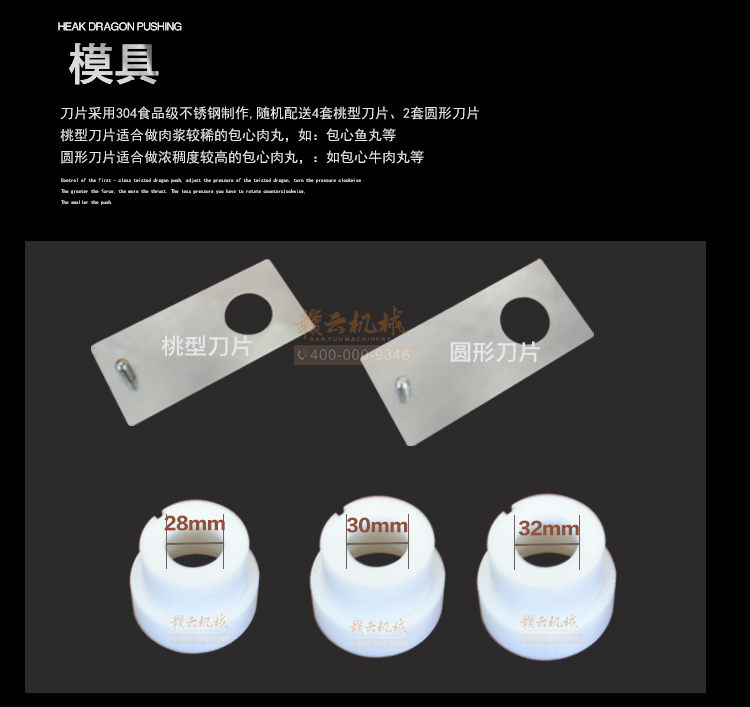 成型模具:28mm、30mm、32mm三種規格,其他規格可定做。本機可生產直徑為28mm-36mm直徑的包心丸子,因此定做的規格直徑不能超過36mm,也不能低于28mm.