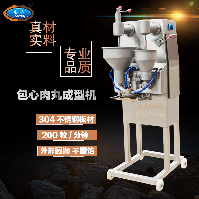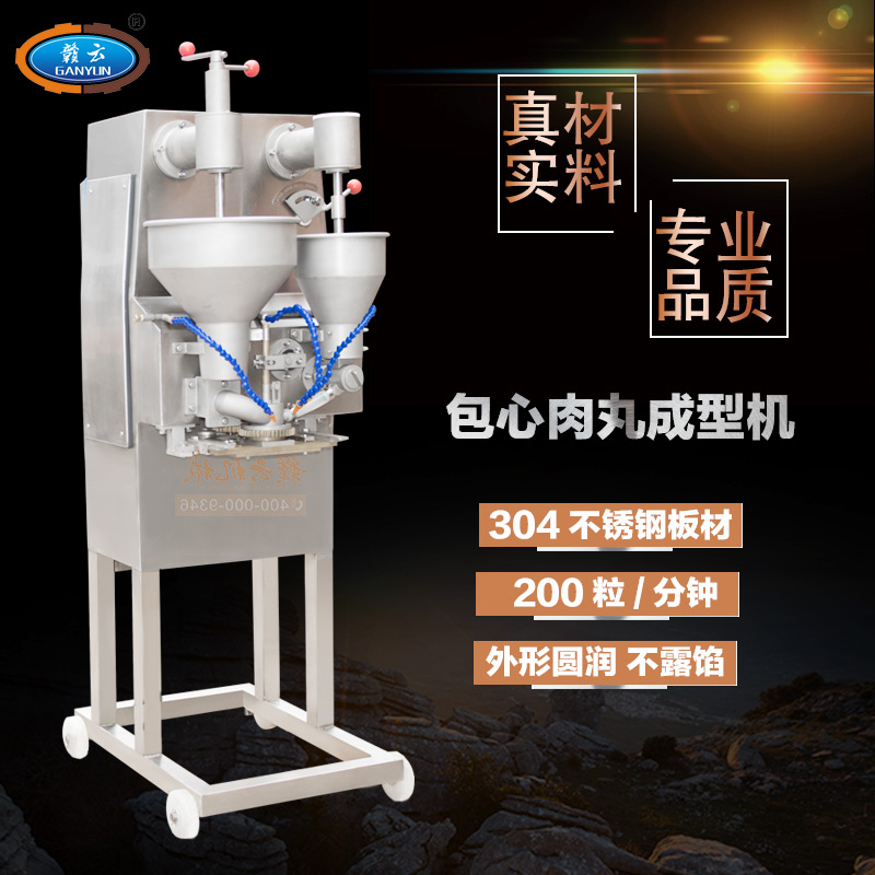 2014冬季新款包心肉丸機,第三代肉丸包心機保留了二代包心機的全部優勢外,在包心成型速度上做了本質上的突破,每分鐘成型200粒的速度是二代包心機的兩倍,機身表面接觸食物部位升級,特殊處理更耐氧化和腐蝕,由于速度上的重大突破,因而稱之為第三代包心肉丸機。