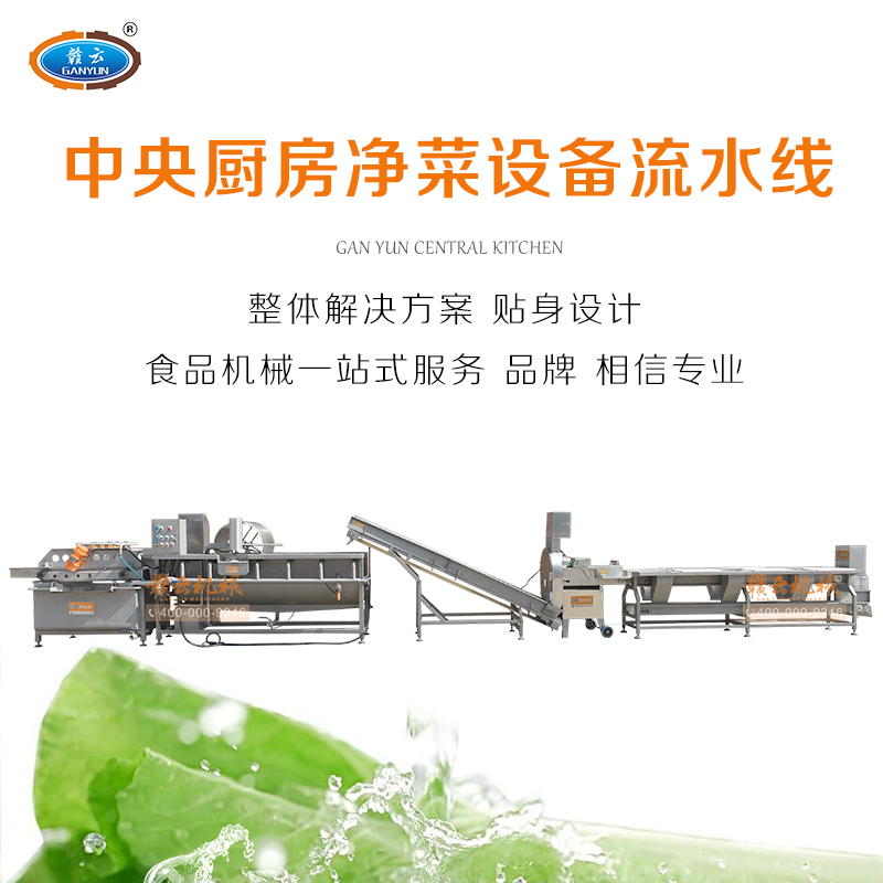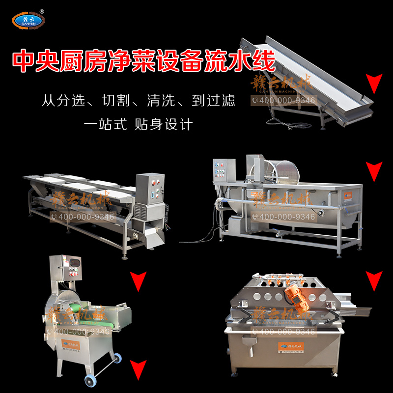 中央廚房凈菜設備流水線_食堂凈菜加工流水線_食堂切配成套設備_贛云掌握中央廚房凈菜設備核心技術,本套設備由分選輸送設備、數字多元化切配設備、提升設備、渦流臭氧清洗去農藥殘留設備、高頻振動機組合而成,可根據客戶需求定制中大型流水線。