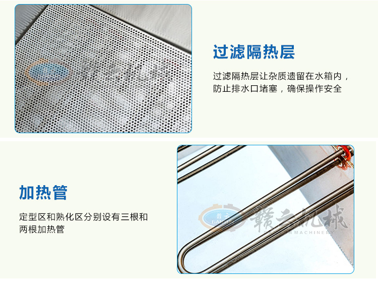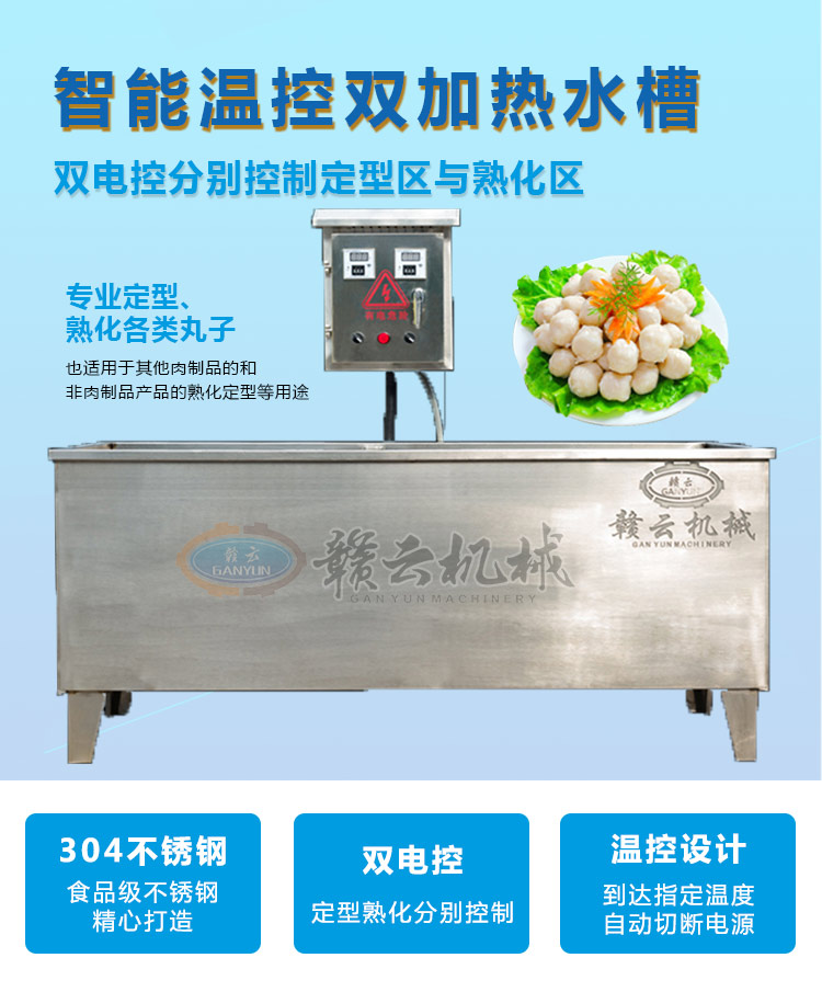 整機采用304不銹鋼板材設計,中間采用發(fā)泡劑,取保溫隔熱作用,雙槽加熱,獨立控制,定型熟化分別控制,加熱速度快,省電更省心。本產(chǎn)品量身設計可配套用于我廠生產(chǎn)的包心肉丸機、牛肉貢丸機、墨魚丸成型機、獅子頭成型機、雙調(diào)速肉丸機、火鍋丸子機組等多種肉丸成型設備使用。可加油,用于油炸丸子的定型熟化,可加水,用于各種肉丸的定型熟化,根據(jù)其加熱作用原理,也適用于其他肉制品的和非肉制品產(chǎn)品的熟化定型等用途。