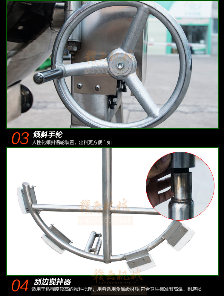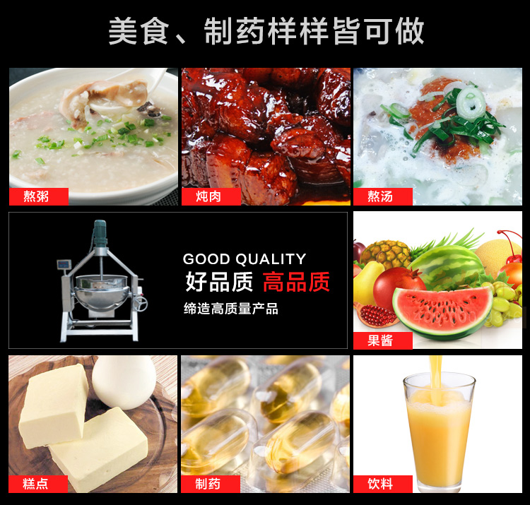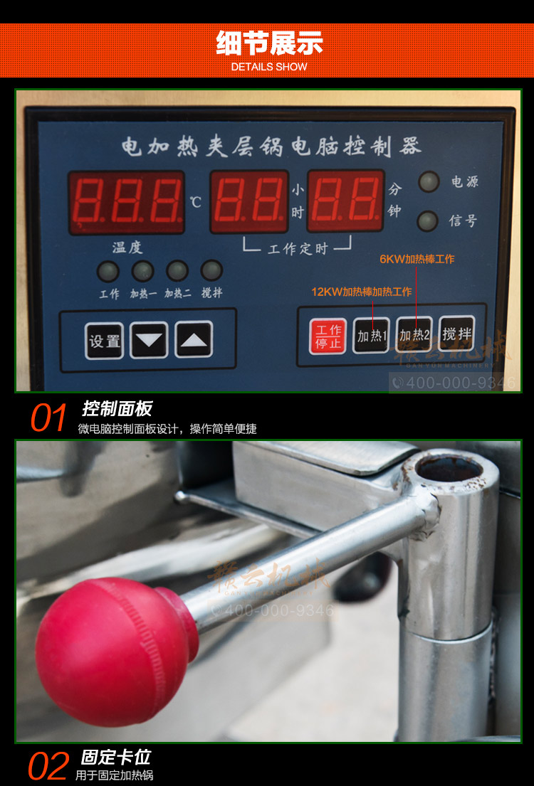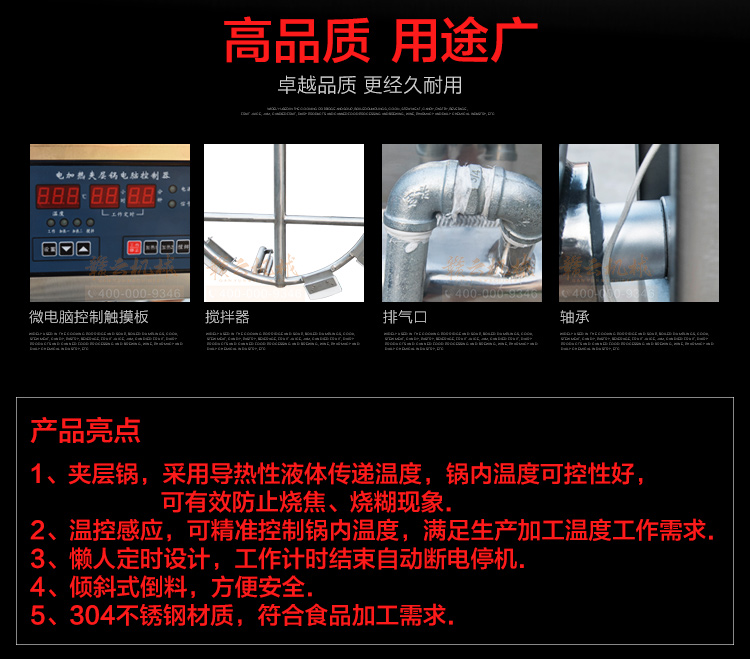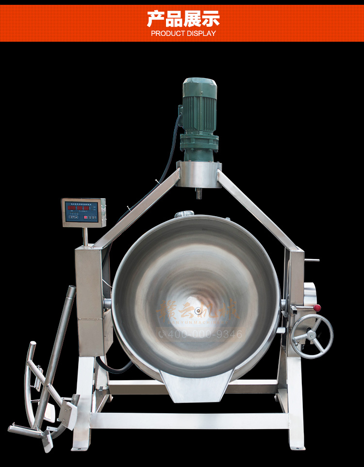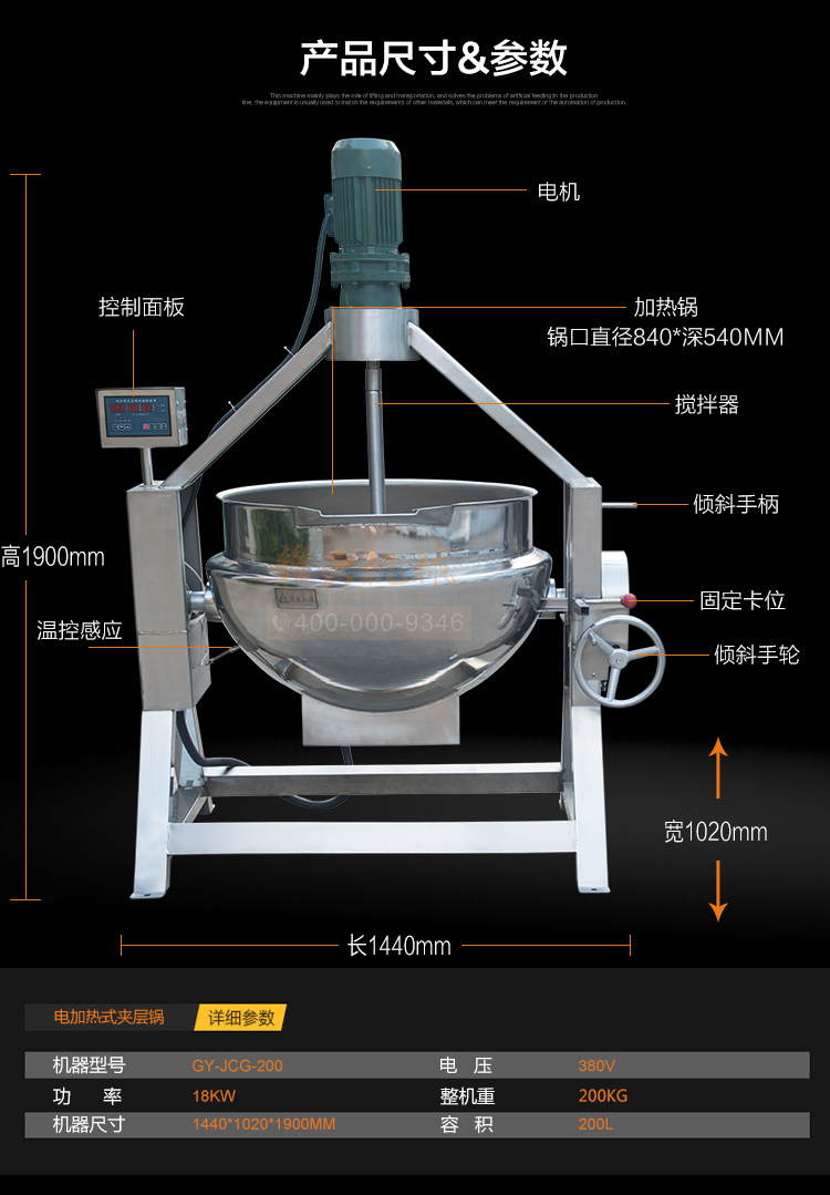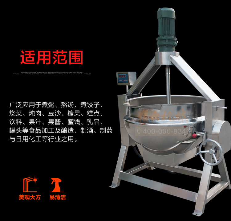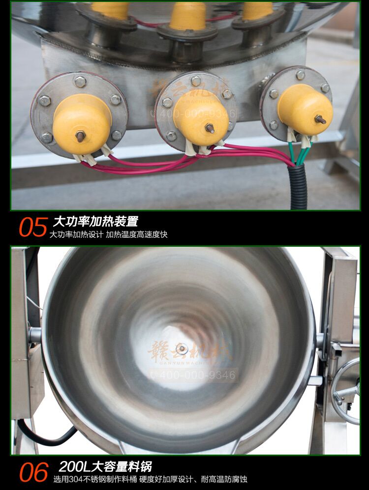 電加熱夾層鍋采用全鋼材質,304不銹鋼鍋,安全衛生,雙加熱按鈕控制,定時溫控帶攪拌功能,是酒店食堂熬湯、炒鍋、攪拌設備之一。200L大容量