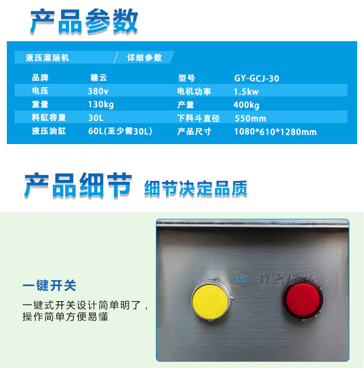 贛云食品機械旗下液壓灌腸機,新款灌漿制腸,此款雙管灌腸機采用液壓灌漿推料原理設計,設備密封性能良好,配合雙管灌漿提高灌腸產量,設備可自動調節灌漿,自動吸料,腳踏開關控制讓人操縱自如。是一款實用的灌漿制腸設備。 注意事項:首次使用前必須加入一桶16KG的46#液壓油