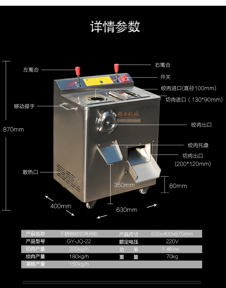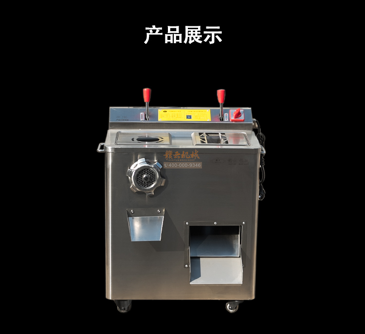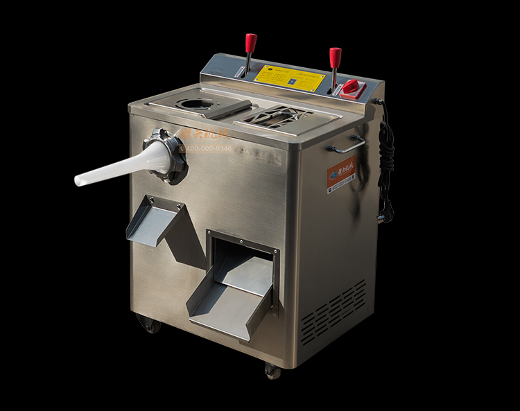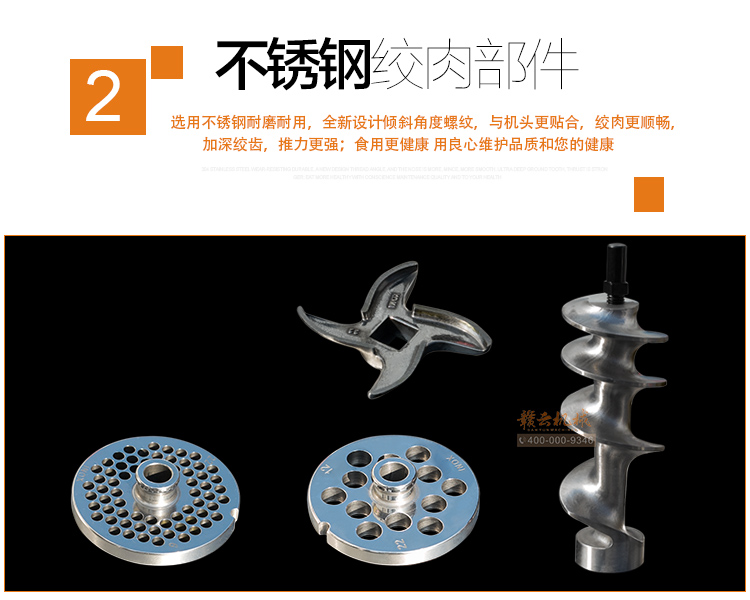 本機采用304不銹鋼板材封裝設計,絞肉十字刀、絞龍及圓刀采用201不銹鋼材質,切肉刀采用特殊加硬鋼材,激光開刃鋒利耐用,雙滾切肉效果好,肉片規則均勻。不銹鋼絞龍絞齒深,咬力更大,絞肉更強勁,離合開關設計,操作方便耐用。