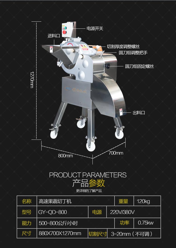 果蔬切丁機可切胡蘿卜丁(條)、馬鈴薯丁(條)、芋頭丁(條)、蕃薯丁(條)、瓜果類丁(條)、洋蔥丁(條)、
