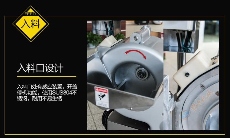 2.1.2 切丁機材料選用必須符合食品衛生要求,機架、殼體、撥盤、料斗及與食品接觸的部件均由不銹鋼制