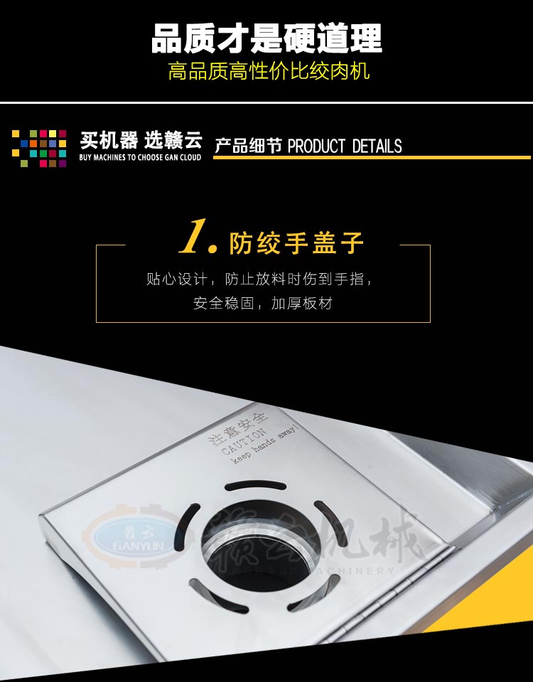 高質量高性價比絞肉機 防絞手蓋子 貼心設計 防止絞肉時傷到手指 放料托盤 包邊設計 安全放心 防水開關人性化設計  人體工程學把手 方便搬運 配有萬向輪 裝配有純銅電機