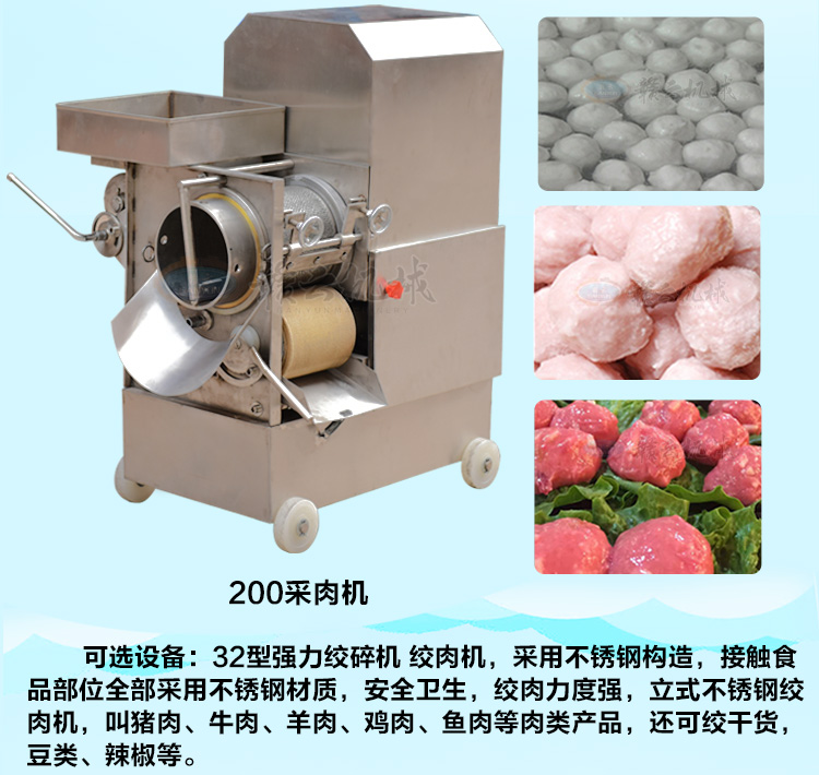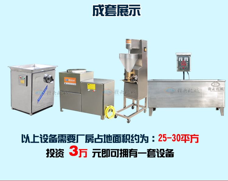 本套設備由42型絞肉機,38型高速(制冷或不制冷)打漿機,加高肉丸成型機(2臺或者雙速成型機或者包心肉丸機)、熟化成型設備(普通雙溫水槽)設備組合而成,專業生產實心肉丸,日產500斤。需要場地面積:25-30平方,供電需求:380V(三相電)產量按工作8小時計算。可選設備:200型采肉機。如選用一下設備可采新鮮魚糜做魚丸蝦丸等。