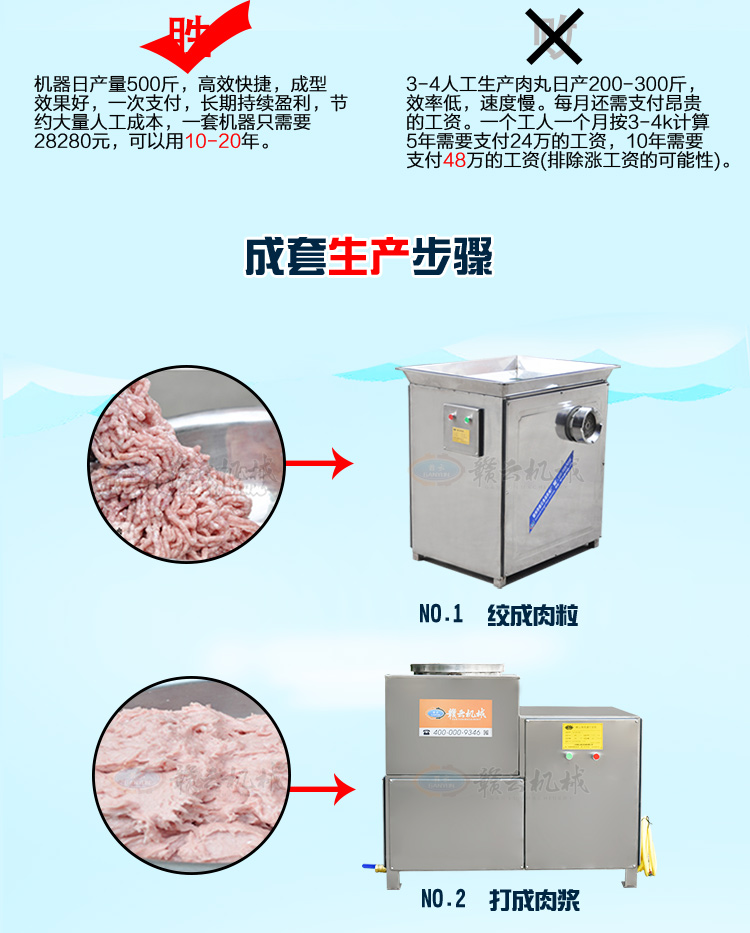 該套設備是生產500斤實心肉丸成套設備,一次性成本,持續收益,低門檻,高收益。3-4人人工生產肉丸,日產量200-300斤,效率低,速度慢。每月還需要支付昂貴的工資。而機器的日產量500斤,成型效果好,節約人工成本,一套機器可以用大概10年-20年。