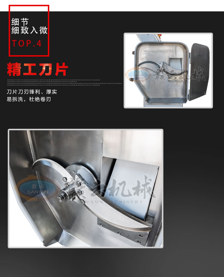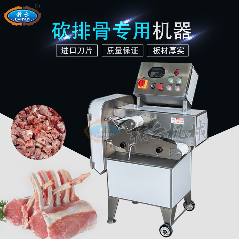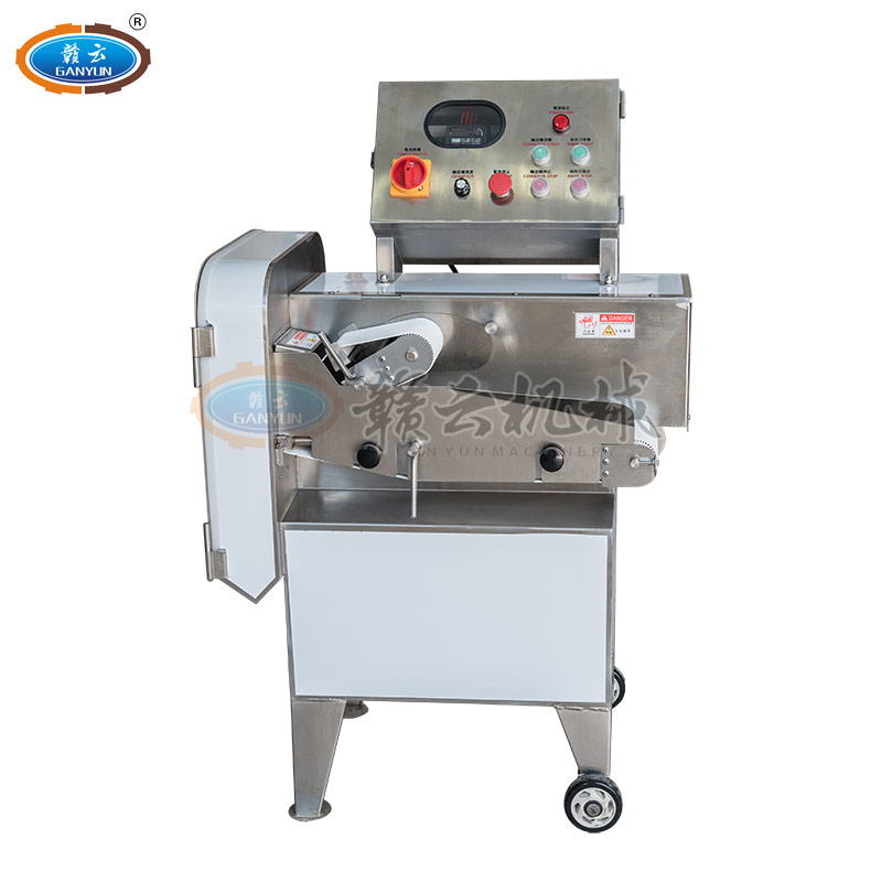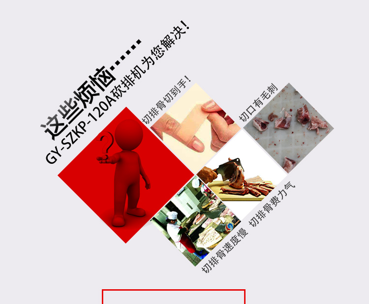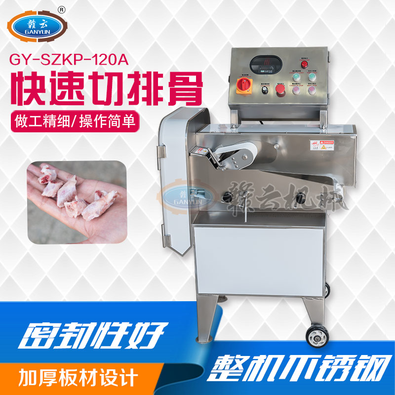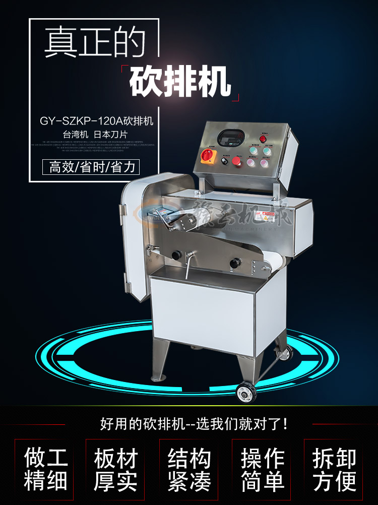 GY-SZKP-120A砍排機,優質刀片。通過調節輸送帶速度控制切骨長短線路排列整齊,防水設計開關按鈕,有機玻璃可清楚的看到變頻器參數。壓菜帶根據不同的需求調節不同的高度,輸送帶采用PVC材質,可拆卸更換輸送帶,拆卸方便。優質刀片,杜絕卷刃。機身背面散熱孔設計,電機運作時散發熱量,散熱孔設計更有效的保護電機的壽命,出料口傳感器設計,機器運作時打開刀盤門機器停止運作,安全穩定,人性化設計。