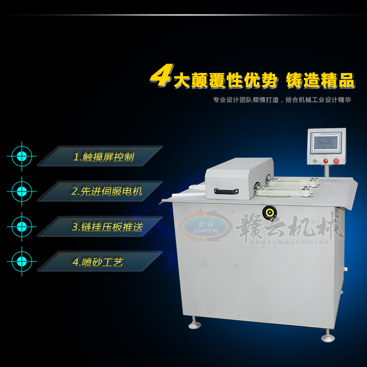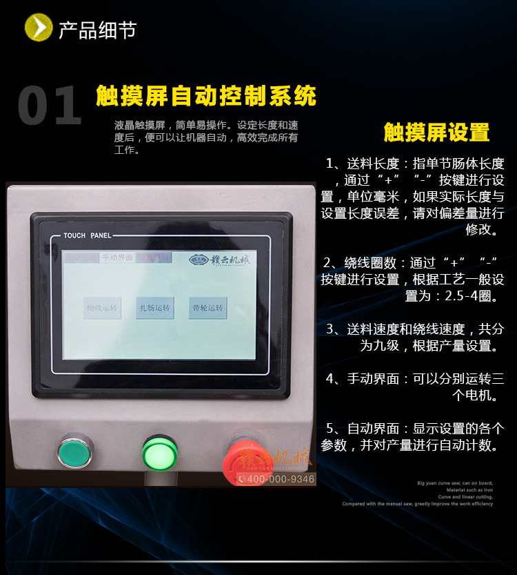 該香腸扎線機機械的優點是節約腸衣,并且線扎的產品不用人工和機械剪節,相對扭結可節約人工3人以上和對剪節設備的投入;相對半自動扎線機可節約10人的費用,切免除工人的體力勞動之苦。該扎線機操控十分簡單,由于采用人機對話的液晶屏,設定長度和速度后,便可以讓機械自動高效完成所有工作。
