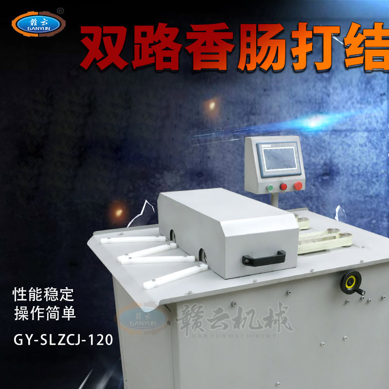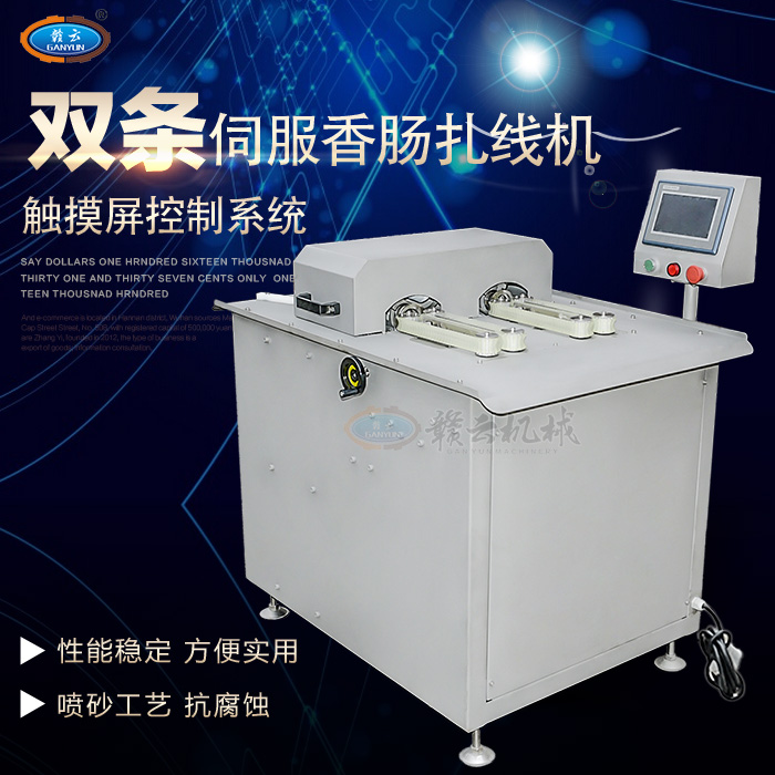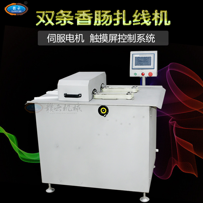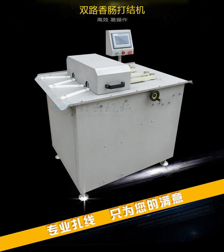 全自動動雙路高速香腸扎線機,自動分份,自動繞線,全程自動化控制。該機采用了優質電機和本公司自主研發的控制系統,機身全不銹鋼制造、效率高、易操控、節約生產原料等優點,產品長度的調節可以隨心所欲