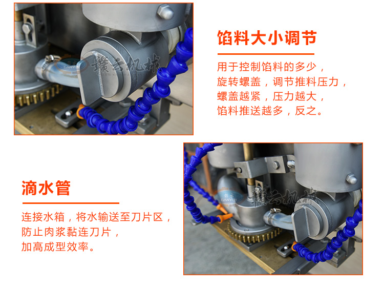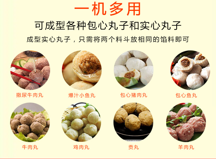 一機多用,可成型各種包心丸子和實心丸子,成型實心丸子,只需要將兩個料斗放相同的餡料即可,是一款實用的肉丸機。