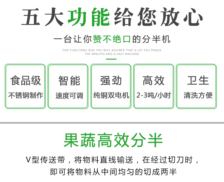 切半機主要用于果蔬類蔬菜加工。可將圓形,橢圓性,長條形,等物料,切割成兩半。該設備常用于以下一些場所,泡菜加工,果蔬類加工廠,政府機關單位,無刀化廚房等。該設備物料切割勻稱,分半大小一致,大顆的白菜蘿卜冬瓜都可一次性分割成兩半。是果蔬加工行業的好幫手