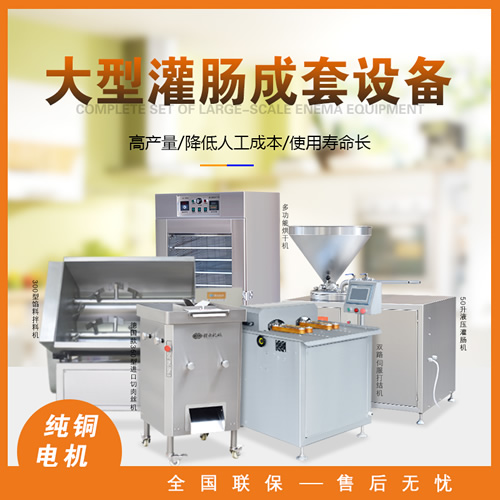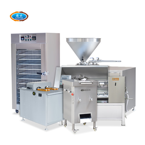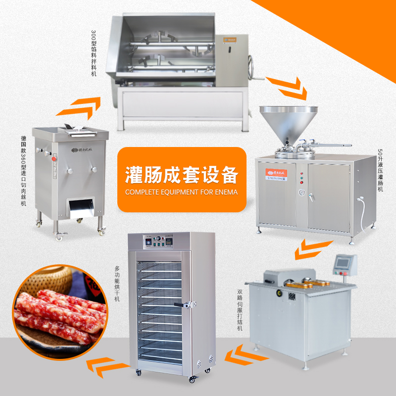 針對本地腸、臘腸、香腸、廣式香腸等生產加工設備,整套包含切肉機、拌餡機、灌腸機、扎線機、烘干機。