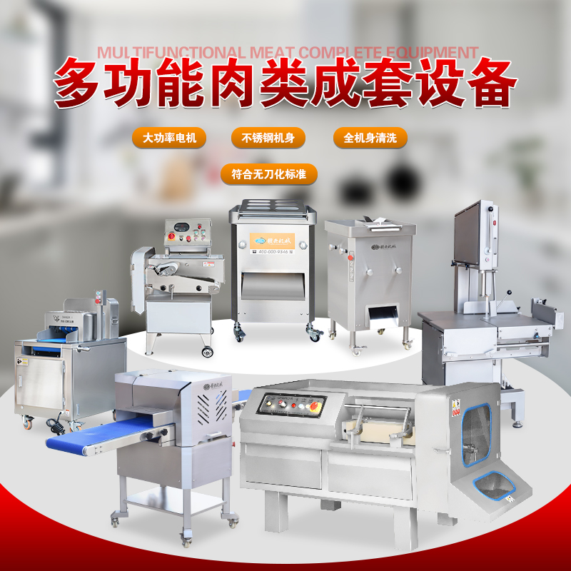 無刀化肉類加工設備,一套符合無刀化加工標準的肉類切割設備:大型自動鋸骨機、智能切塊機、120A智能砍排機、360型切肉絲機、300型切肉片機、350型平行開條機等等。