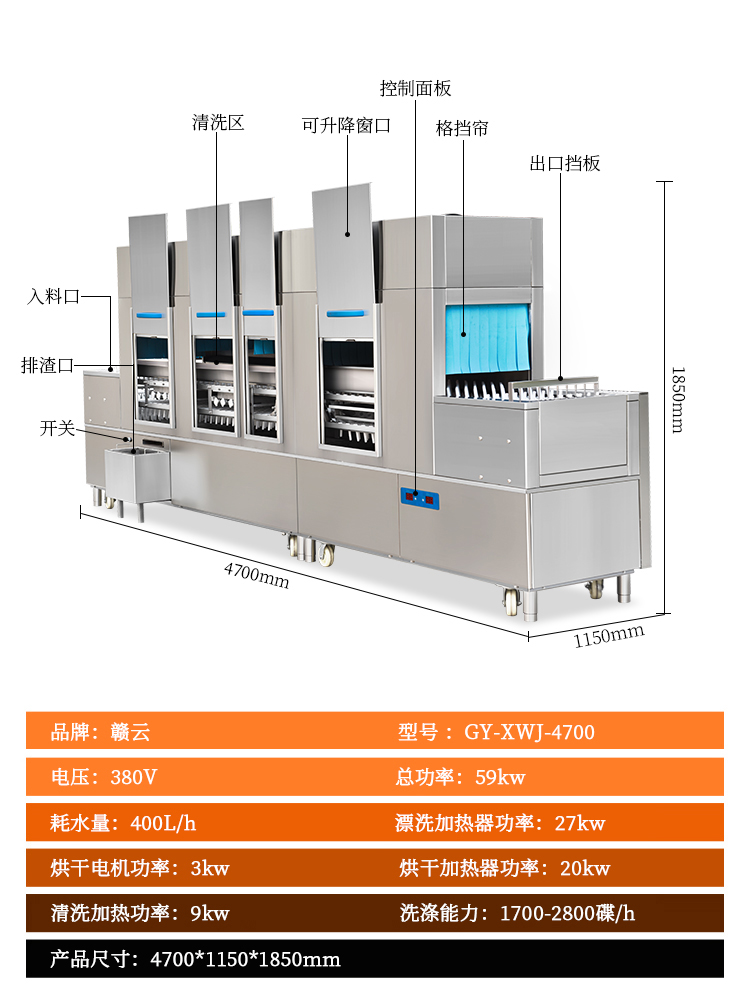中央廚房設備長龍式洗碗機,機器采用不銹鋼材質,這款商用洗碗機是一款能自動清洗碗、盤、碟等餐具的設備,機器主要功能是清洗/消毒/烘干/排渣一體的多功能自動洗碗機,了解更多的中央廚房設備,如:洗碗機,商用洗碗機,大型洗碗機,爐灶等中央廚房設備,找贛云食品機械
