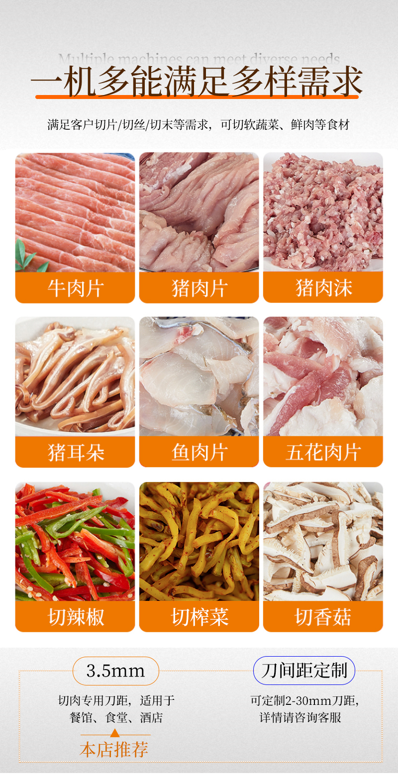 適用于鮮肉、軟蔬菜等切片、切絲、切末等。