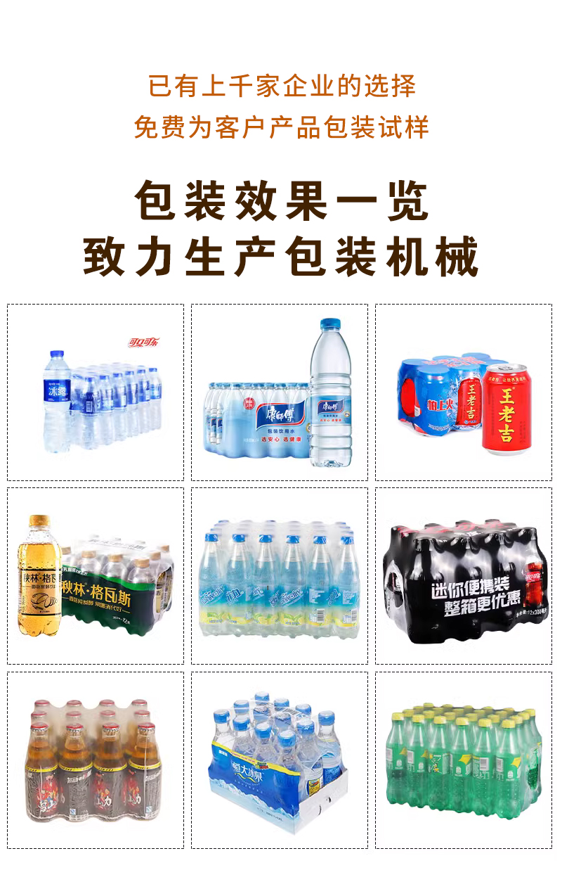 適用于飲料、酒水、礦泉水瓶、五金材料、裝修材料等外包裝自動套膜收縮等。