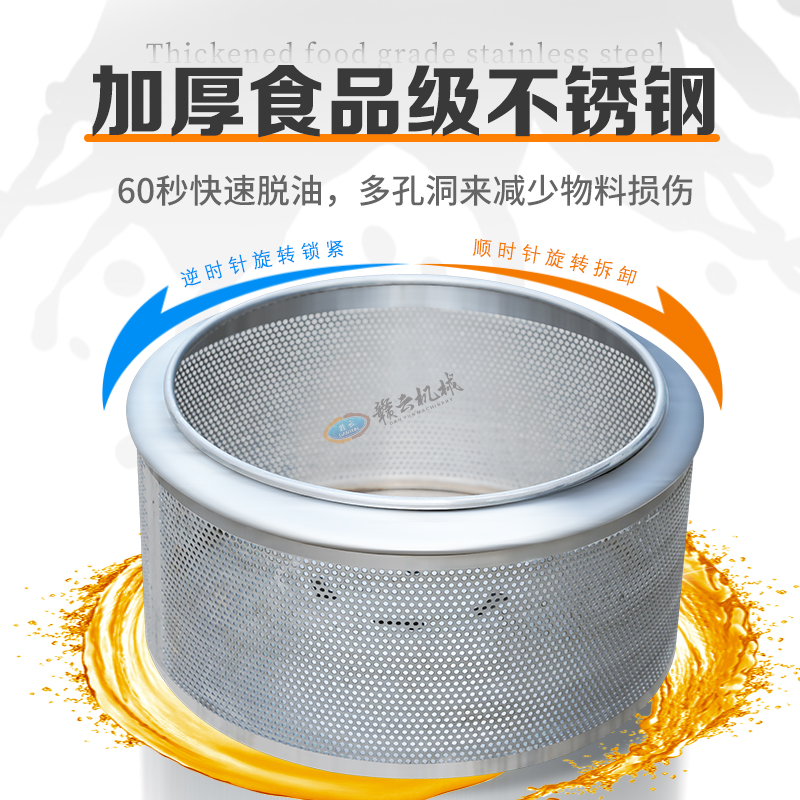 高效自動脫油機,引進離心技術,專為快速脫油/脫水設計,設備內置減震系統確保穩定運行。60秒極速脫油,多孔洞設計減少物料損傷,保護食材原汁原味。大容量的可拆卸活動內桶易于清潔維護,采用食品級不銹鋼材質更安全健康。食品脫油機廣泛應用于蔬菜、肉制品、蝦仁等食品加工,及五金、化工、紡織行業的油漬水漬分離。