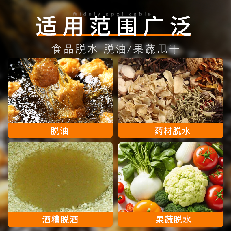 適用于蔬菜、肉制品、蝦仁、酒糟、豆腐渣等食品果蔬藥材油炸油漬、水漬快速甩干分離,也可以用于五金、化工、紡織行業的油漬分離等。