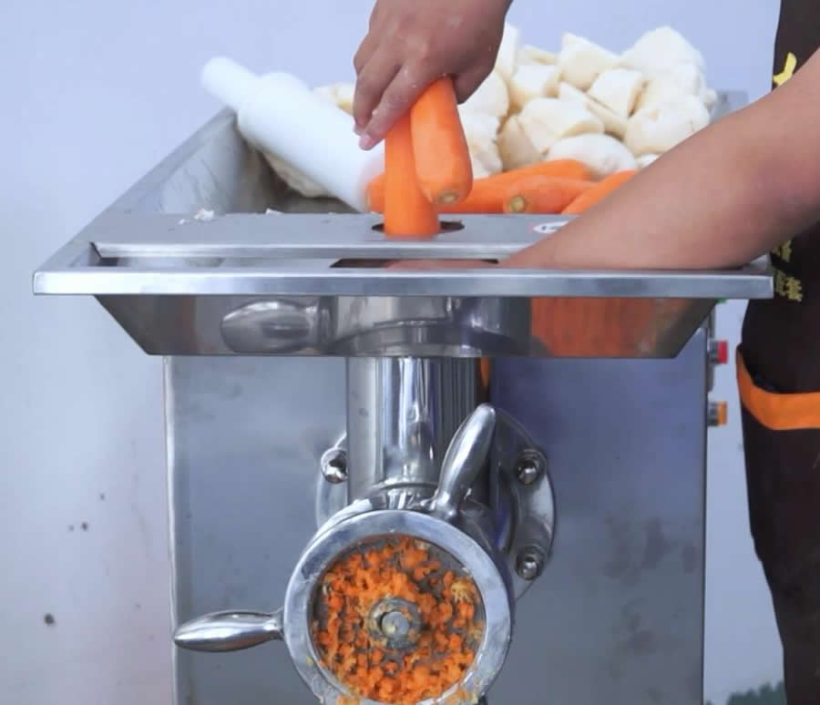 首先將所有原料準(zhǔn)備好,原料有:鮮豬肉(比例為:瘦6肥4)、胡蘿卜、生姜、小蒜、馬蹄、淀粉、冰水等。第一步是需要將原料通過絞肉機(jī)絞碎,這一步是使用贛云42型不銹鋼絞肉機(jī),這臺機(jī)器可以用于鮮肉、微凍肉類、蔬菜等絞碎,機(jī)器動(dòng)力強(qiáng)勁,絞肉速度快,每小時(shí)可達(dá)600公斤。