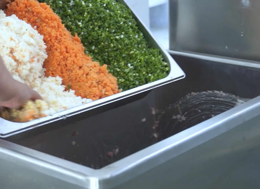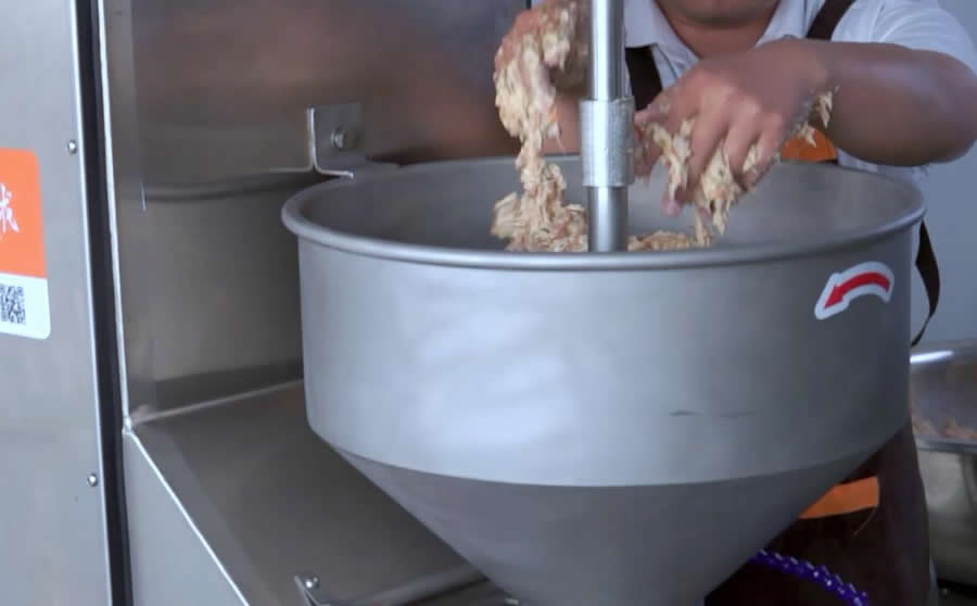 將通過絞切處理后的食材根據(jù)工藝比例倒入這臺自動(dòng)化不銹鋼拌餡機(jī)。拌餡機(jī)可對粒狀、粉狀、泥狀物料根據(jù)需求設(shè)定攪拌時(shí)間,機(jī)器擁有5槳交錯(cuò)攪拌,操作過程中可自動(dòng)切換正反轉(zhuǎn),這臺機(jī)器單次一桶可加工100L物料。