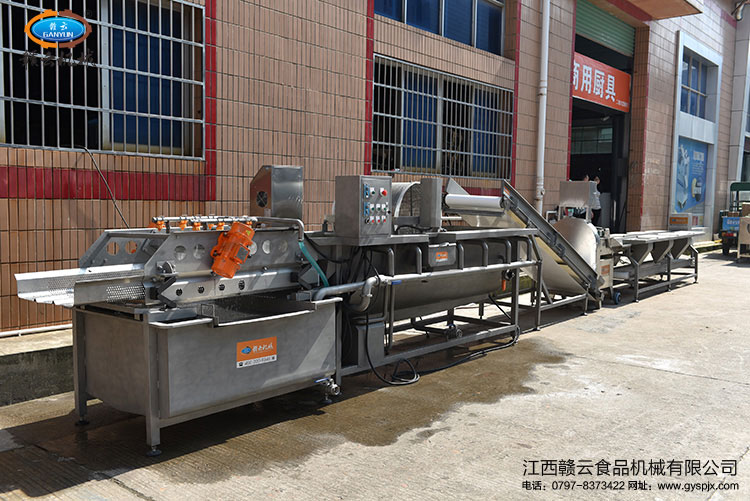 贛云中央廚房凈菜設備流水線操作演示,蔬菜凈菜加工自動化生產線,本套設備采用人工分選輸送設備、數字多元化切割設備、提升設備、渦流臭氧清洗設備及高頻振動過濾設備組合而成,模擬手工作業原理設計,蔬菜經過人工挑選將所切物料放入輸送帶內,經過切割清洗過濾后即可包裝或烹制,整個環節節省人力成本,時間成本和運營成本,利用臭氧發生器結合渦流清洗設備能有效降解農藥殘留,清除肉、蛋中的抗生素、化學添加劑、激素等有害物質,殺滅海鮮中容易引起中毒的嗜鹽性菌等,以保證物料的鮮度。