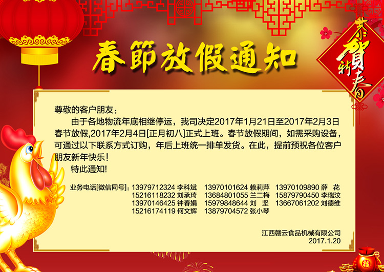 2017年2月4日[正月初八]正式上班。春節(jié)放假期間,如需采購設(shè)備,可通過以下聯(lián)系方式訂